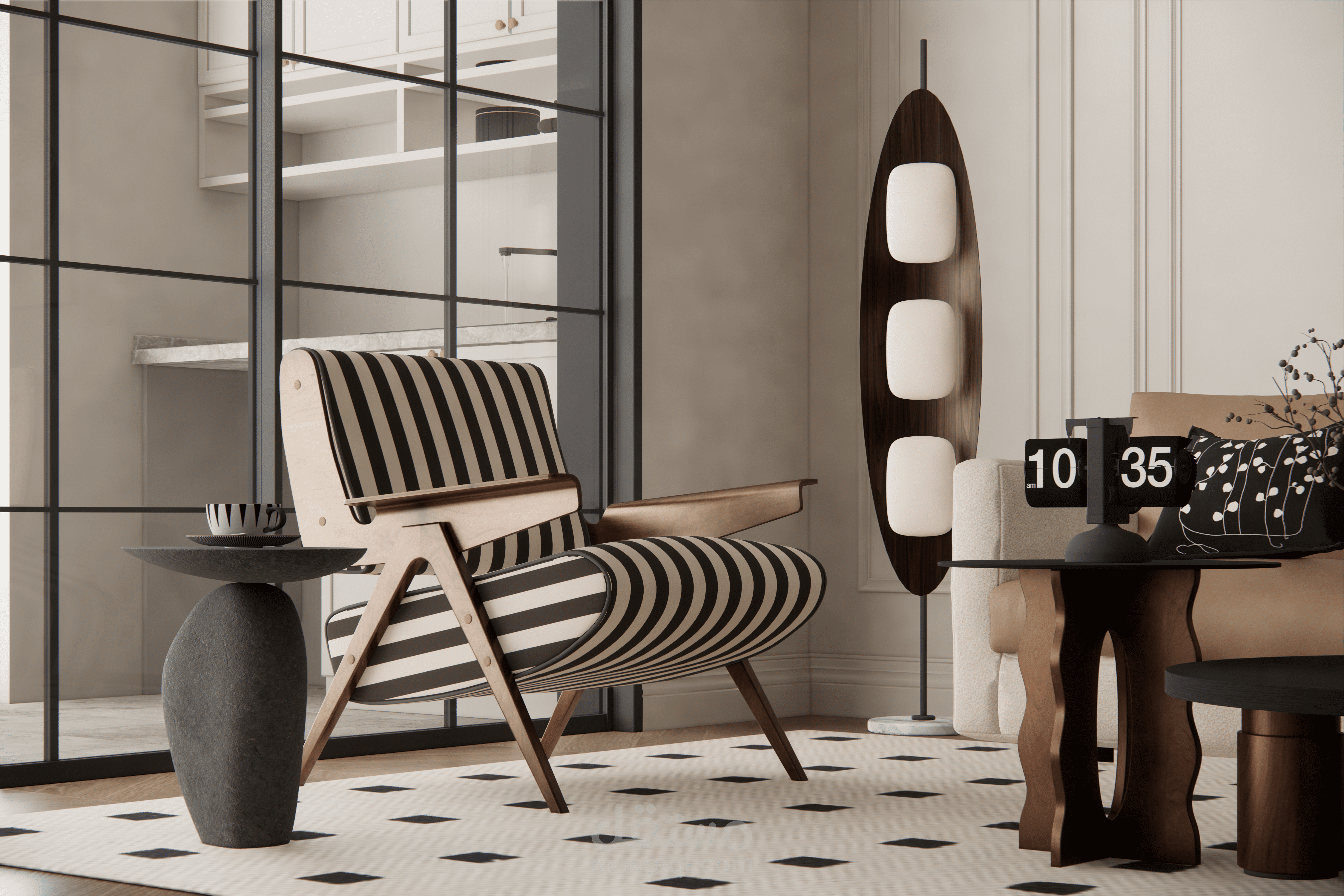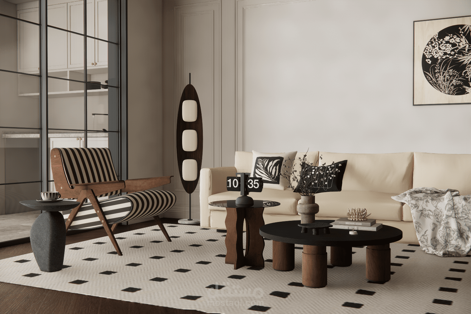 الإكسسوارات مثل الساعة العصرية والفازات الصغيرة والنباتات الداخلية تكمّل المشهد وتمنحه حياة وواقعية.