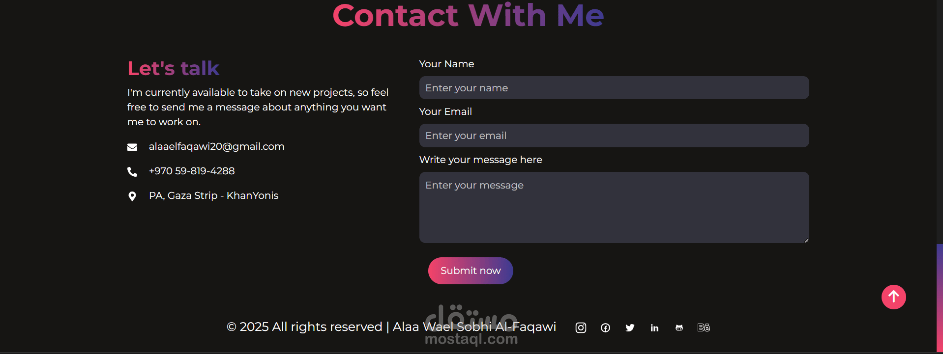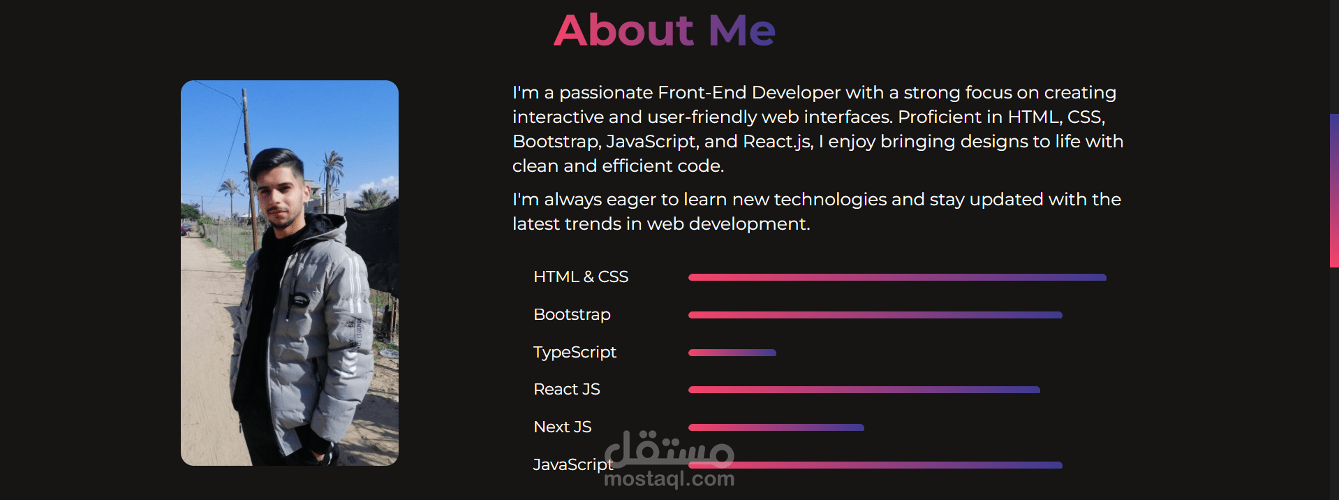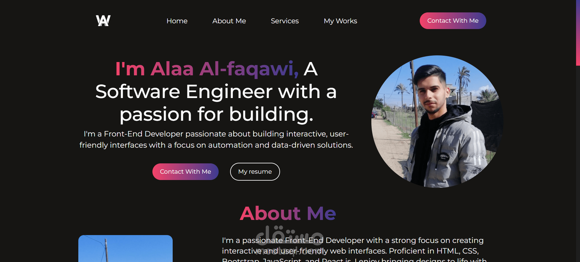 موقع شخصي تفاعلي يُستخدم كبورتفوليو (Portfolio) لعرض المهارات والخبرات الخاصة بمطور واجهات أمامية. يحتوي الموقع على تصميم عصري وأنيق، ويُبرز هوية صاحب الموقع بشكل احترافي.
