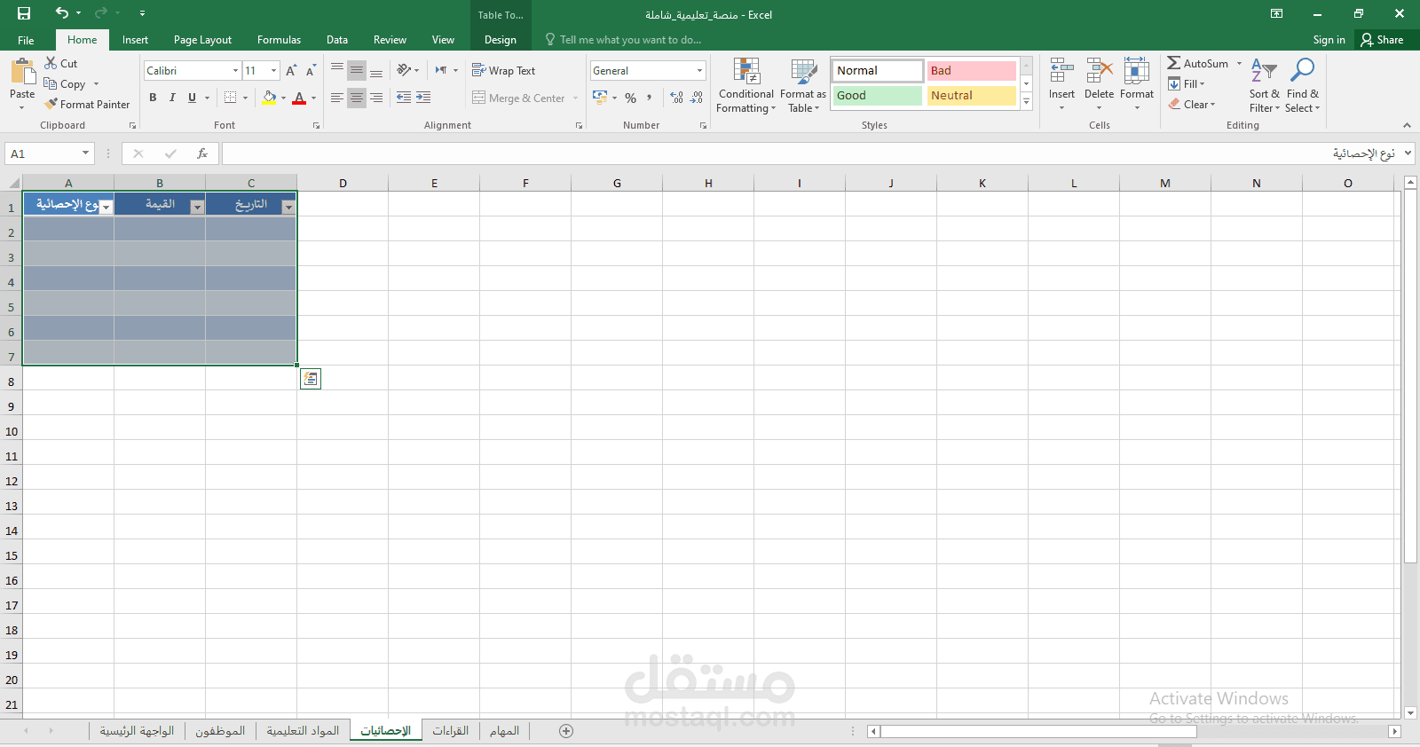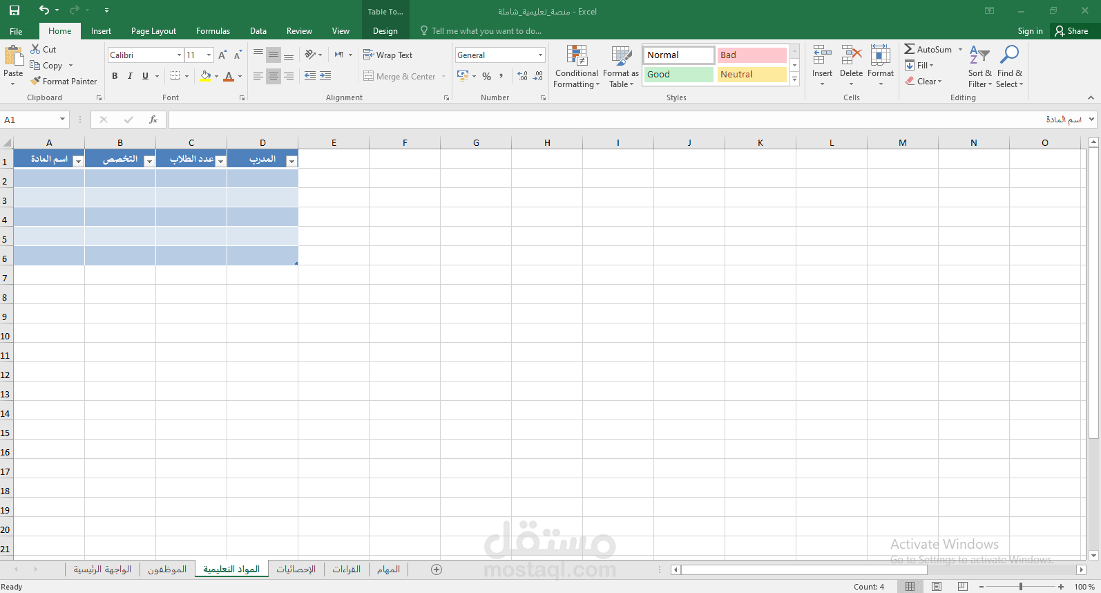 جدول بيانات مركزي واحترافي يربط بين جميع عناصر المنصة التعليمية، ويكون سهل الاستخدام ويحتوي على إحصائيات وبيانات دقيقة، مع تنظيم العمل بين الموظفين وتتبع المهام والقراءات.