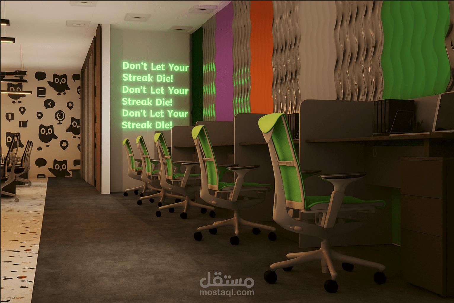 This administrative building design for Duolingo reflects the brand's playful, tech-driven, and user-centered spirit. The concept blends modern simplicity with vibrant branding elements—featuring Duolingo’s iconic characters, bold colors, and clean geometric forms throughout the space. The interior promotes collaboration and creativity through open-plan workspaces, interactive zones, and tech-integrated meeting rooms.