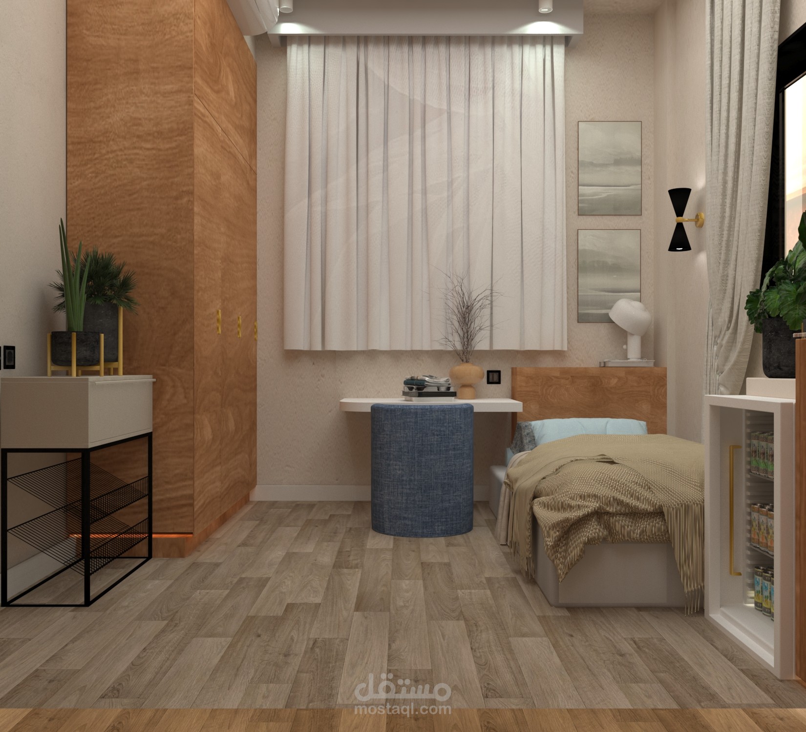 Styled in a transitional aesthetic, the design blends classic elements with a clean, modern feel. Light color tones dominate the palette to visually expand the small space and enhance natural brightness. Smart storage solutions and minimal, functional furniture create a balanced environment that supports both duty and rest.