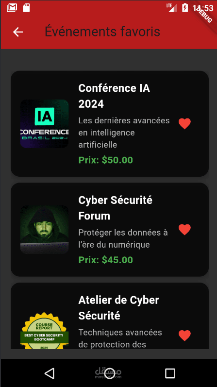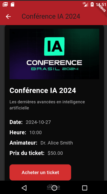 يمكن للمستخدمين مشاهدة قائمة بالفعاليات المتاحة، بما في ذلك التفاصيل مثل العنوان، والتاريخ، والسعر، والمتحدثين.