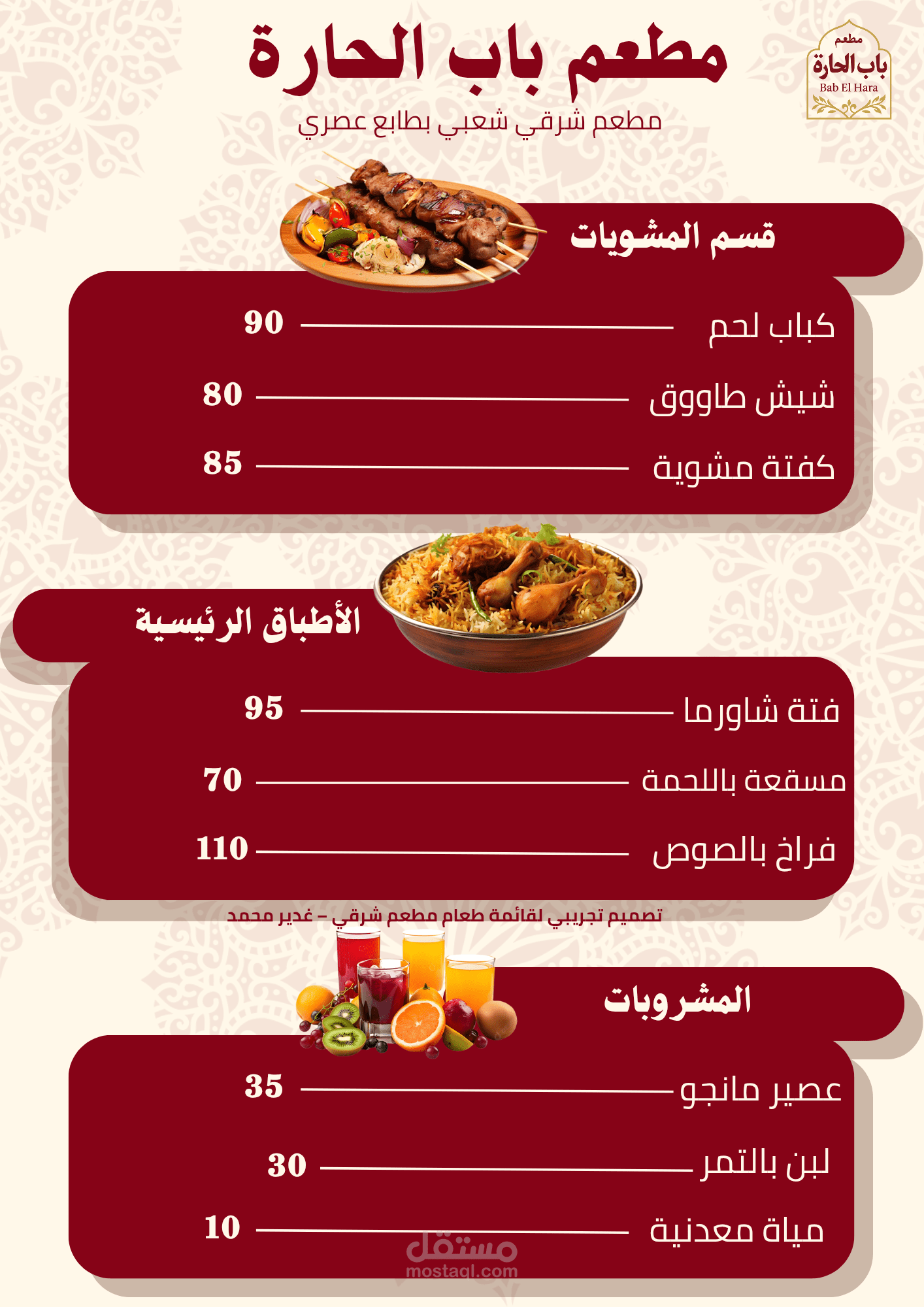 قمت بتصميم منيو طعام ولوجو تجريبي لمطعم شرقي وهمي باسم "باب الحارة"، باستخدام عناصر مستوحاة من الهوية العربية التقليدية مع لمسات عصرية.