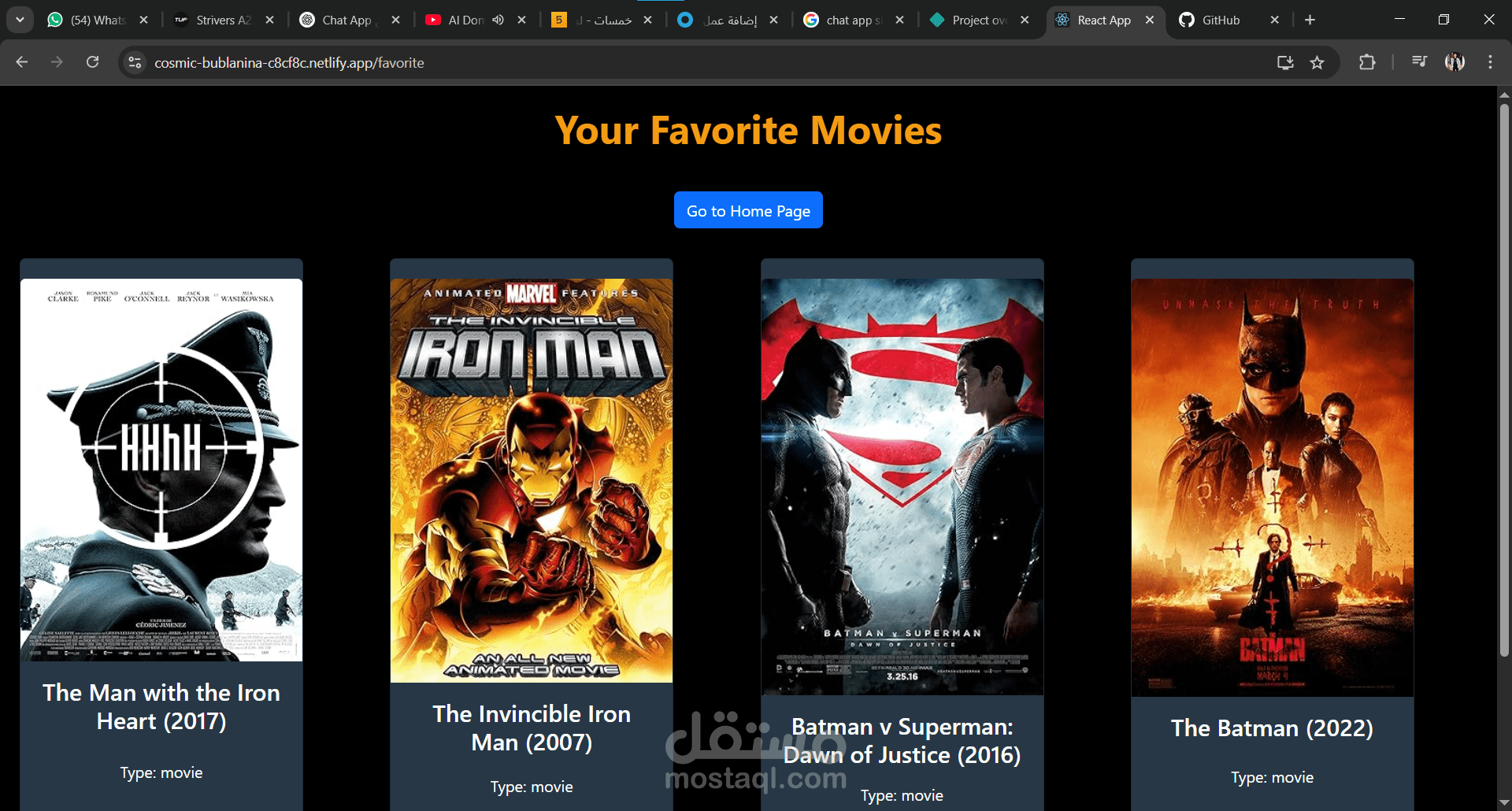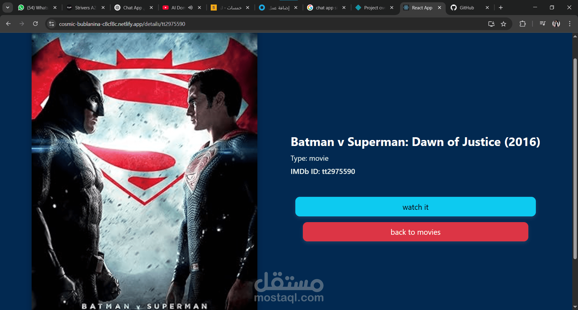 يتميز التطبيق بتصميم بسيط وأنيق باستخدام React وBootstrap 5، ويعرض معلومات الأفلام مثل العنوان، الملخص، التقييم، والصورة.