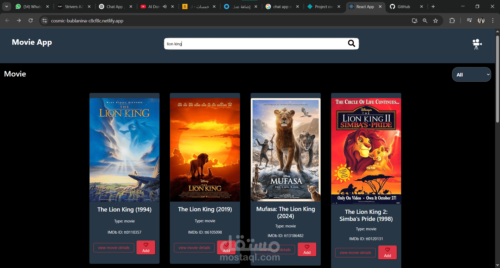 تطبيق تفاعلي مميز يسمح للمستخدم بالبحث عن الأفلام باستخدام واجهة TMDB API.