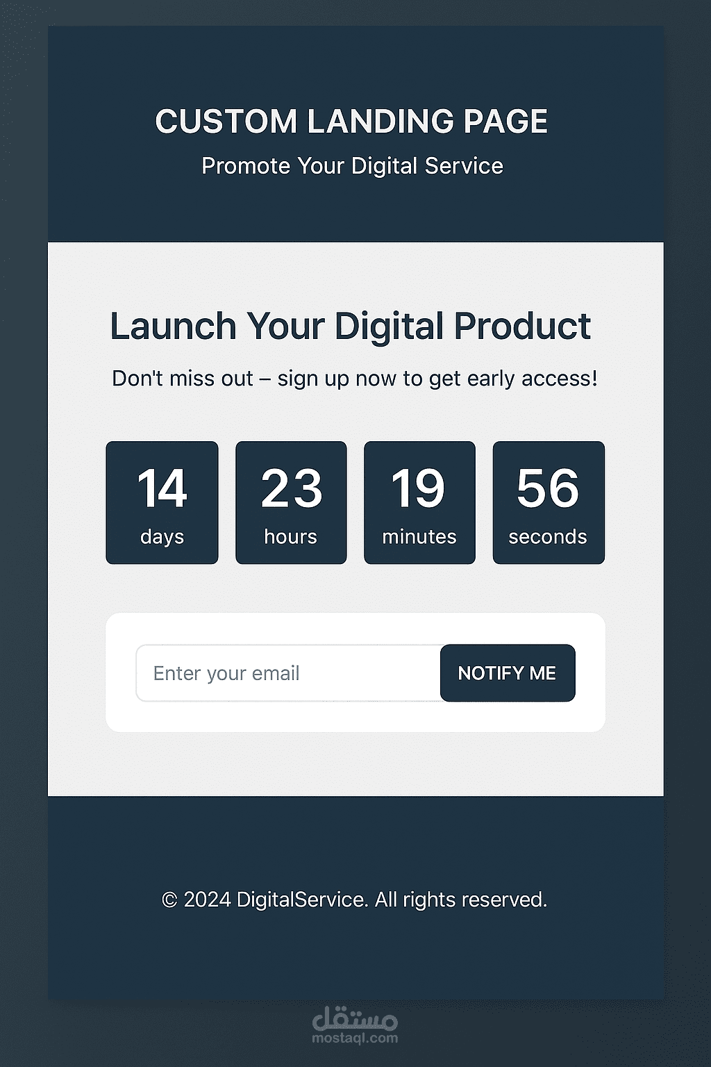 استخدمت JavaScript لعمل عدّاد تنازلي ونموذج اشتراك تفاعلي.