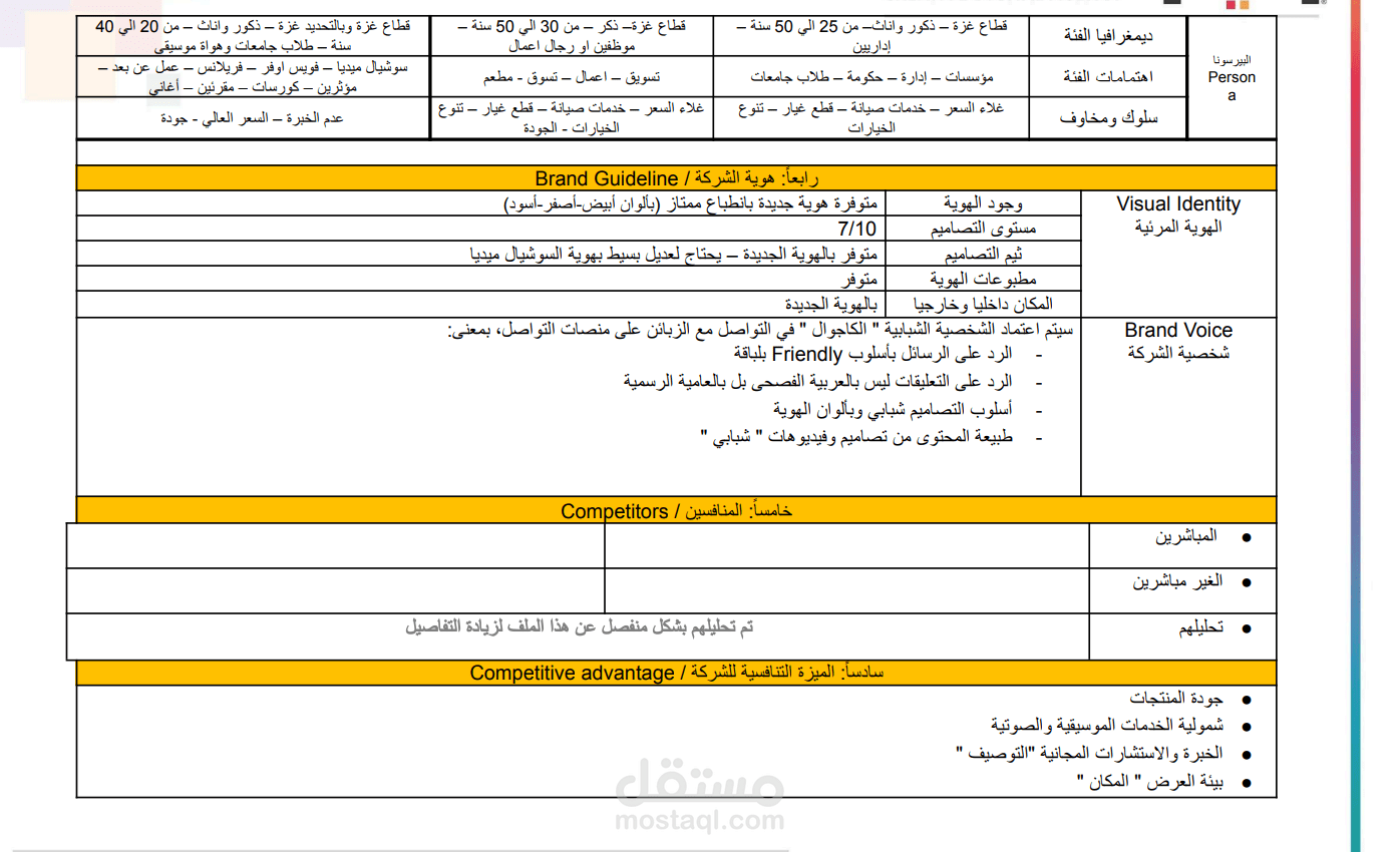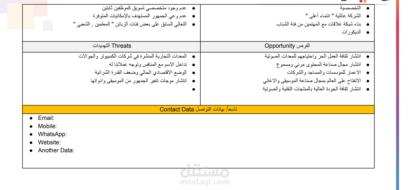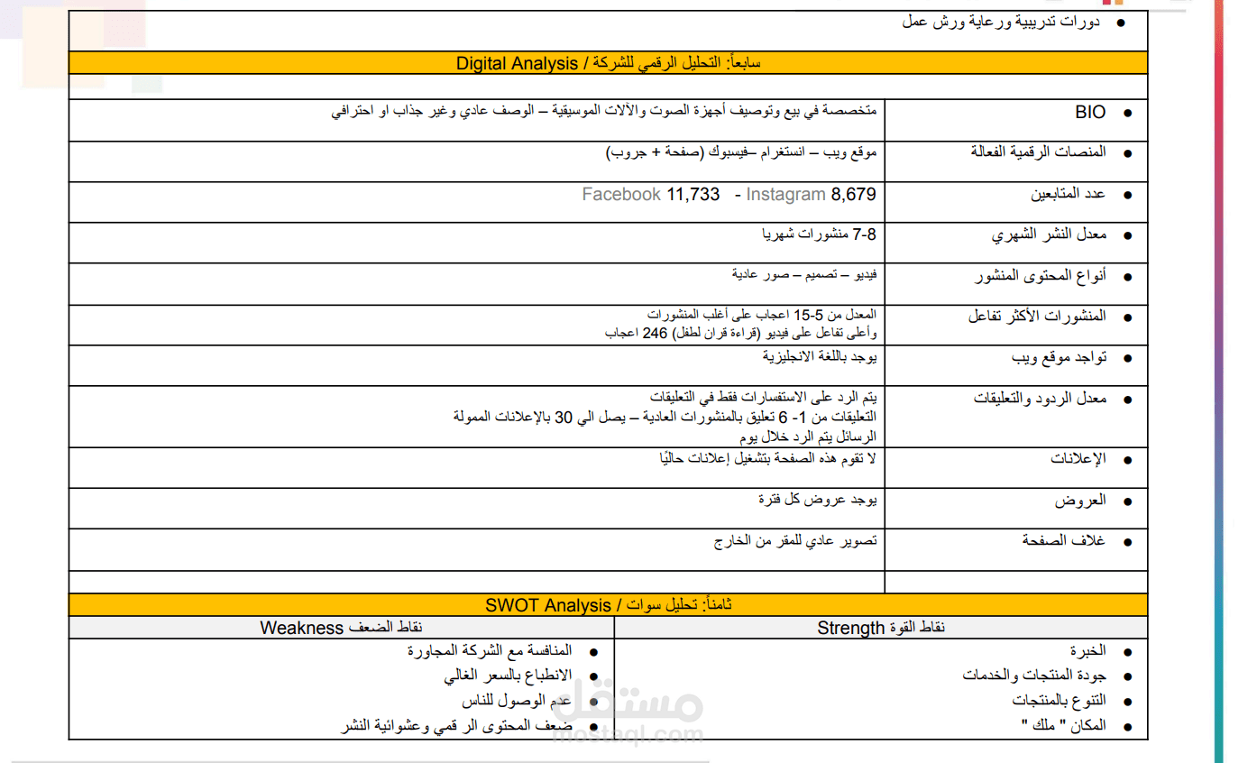 هذا النموذج يعرض ملف عمل متكامل (Company Brief) وتحليل SWOT استراتيجي قمت بإعداده لشركة متخصصة في مجال الآلات الموسيقية والصوتيات. كانت الشركة تمتلك منتجات وخدمات واسعة لكنها تفتقر إلى نظام تسويقي وهوية رقمية واضحة للوصول إلى فئاتها المستهدفة المتنوعة.