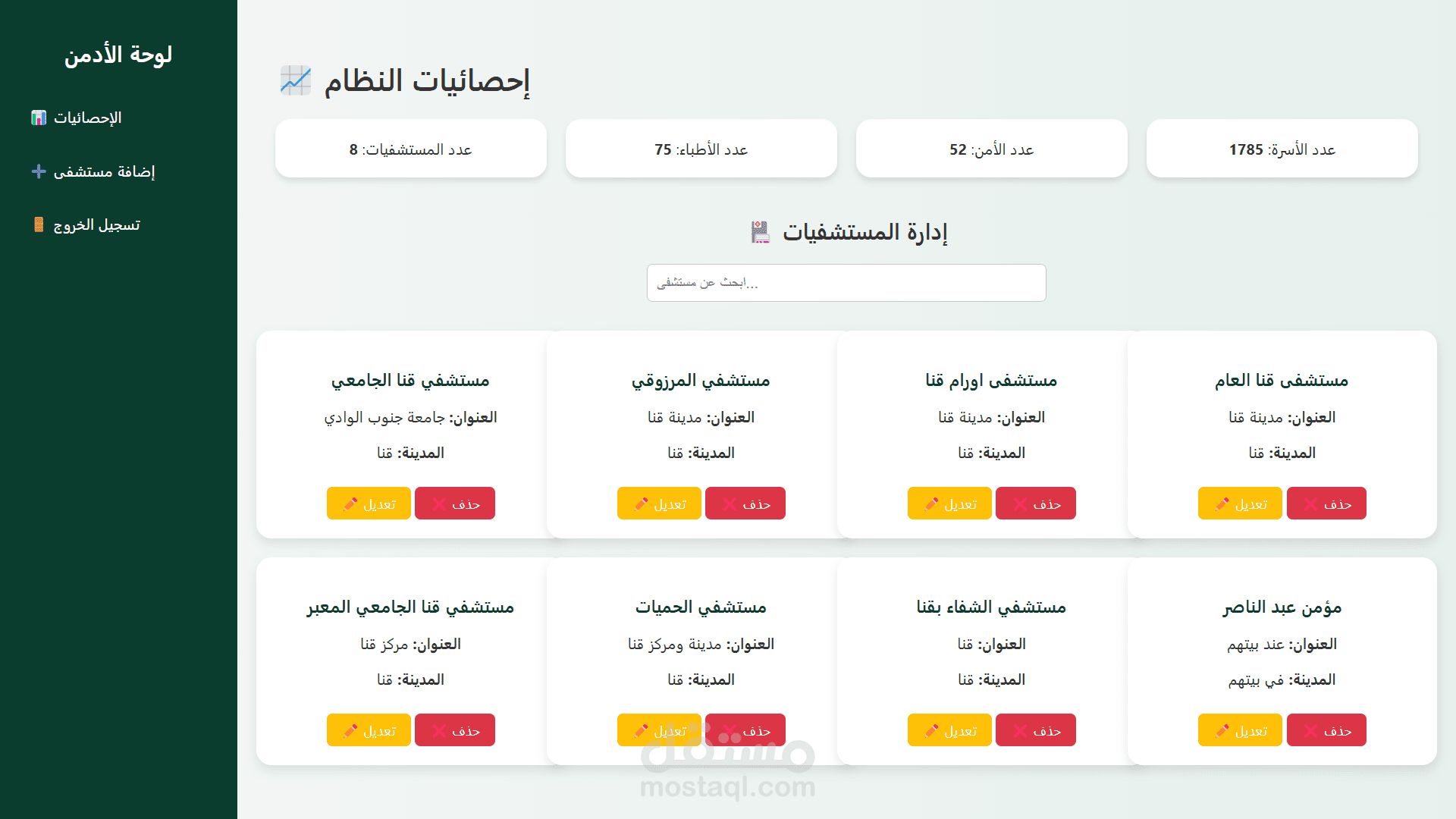 A comprehensive hospital management system developed using PHP and MySQL, designed to manage hospital data efficiently. The system includes user authentication (admin and normal users), hospital listings, and admin features like statistics dashboard and hospital management (add, edit, delete). It supports a structured database with patients, doctors, diagnoses, and specializations, all integrated into a dynamic web interface.
