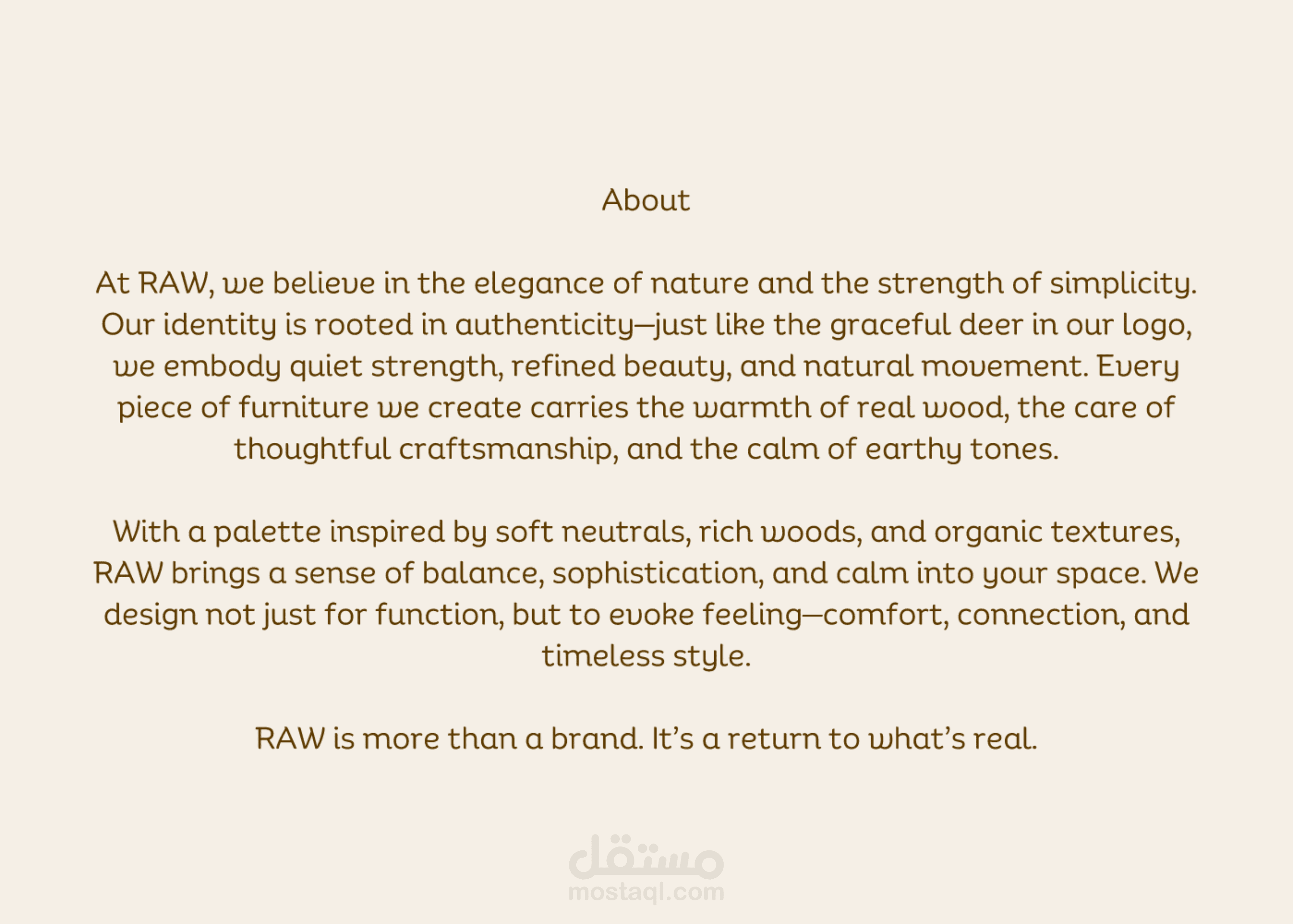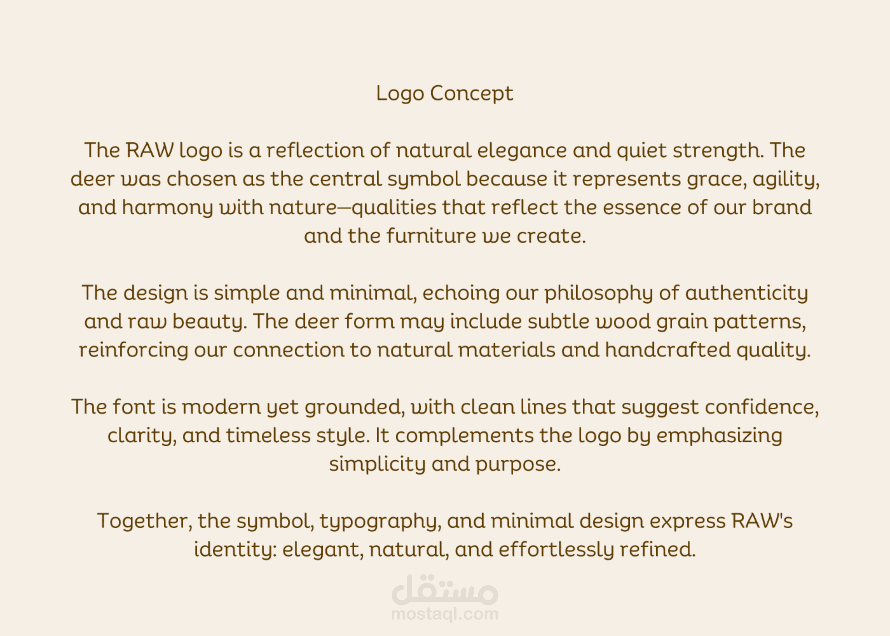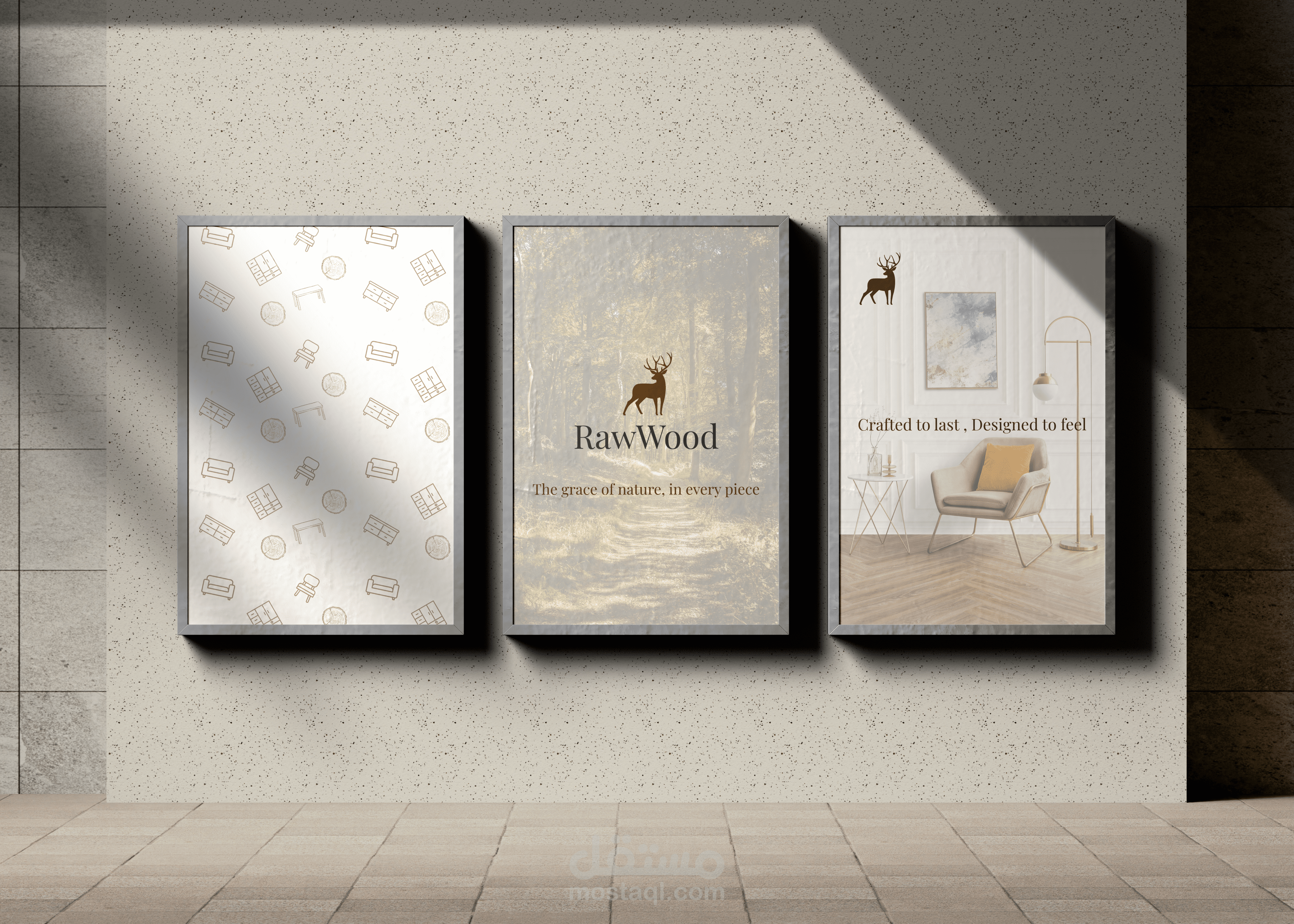 تم تصميم الهوية البصرية لبراند RAW لتعكس جوهر العلامة القائم على الهدوء، الرشاقة، والأصالة. اُختير رمز الغزالة في الشعار لما تحمله من معاني الأناقة الرشيقة والقوة الهادئة، وهي صفات تمثل روح الأثاث الذي يقدمه البراند—طبيعي، بسيط، ومتناغم مع محيطه. استخدمت درجات البيج، البني الخشبي، والنحاسي الناعم لتجسيد إحساس الدفء والفخامة الطبيعية، ولتعكس الخامات الخام التي يستوحي منها البراند فلسفته.