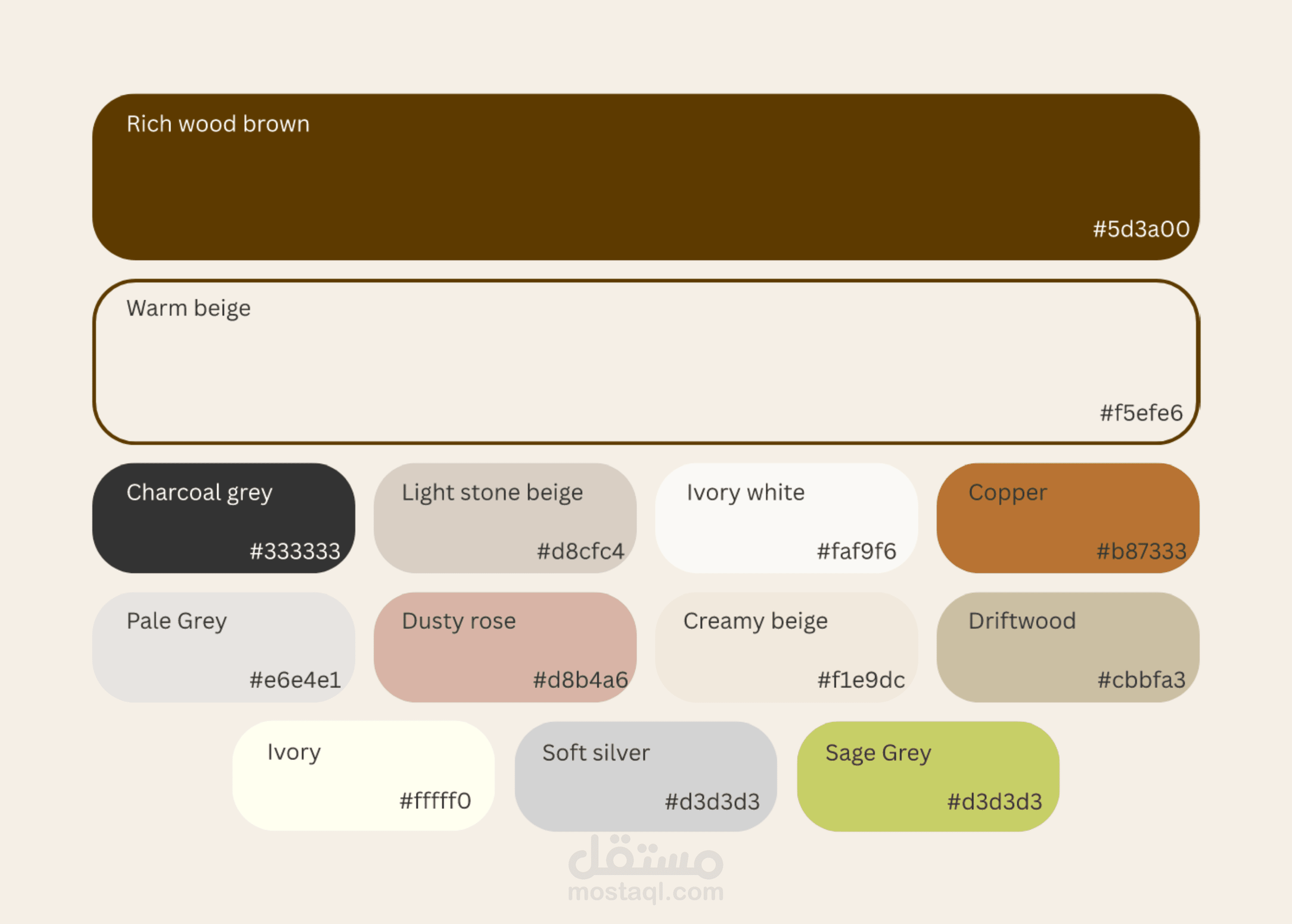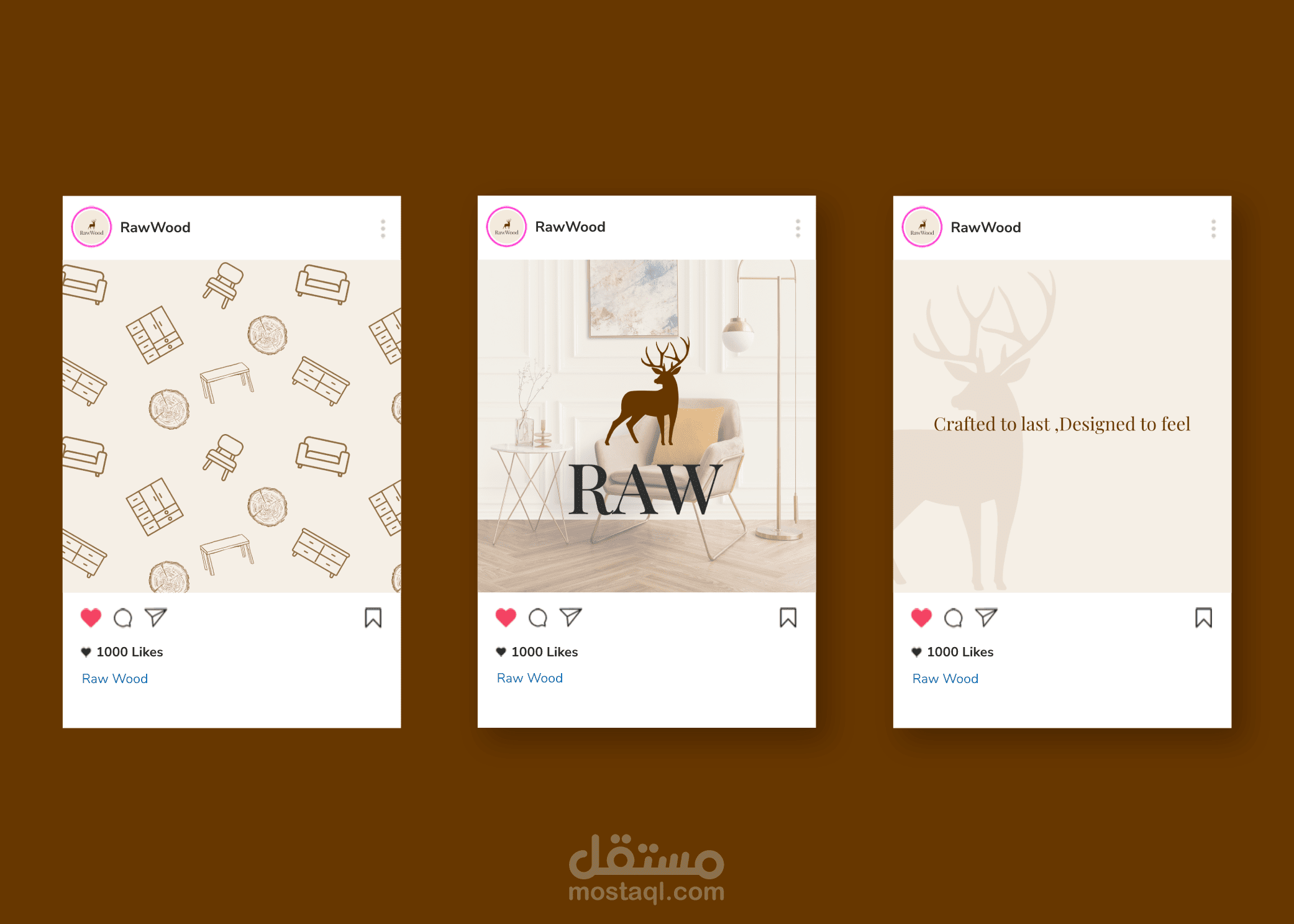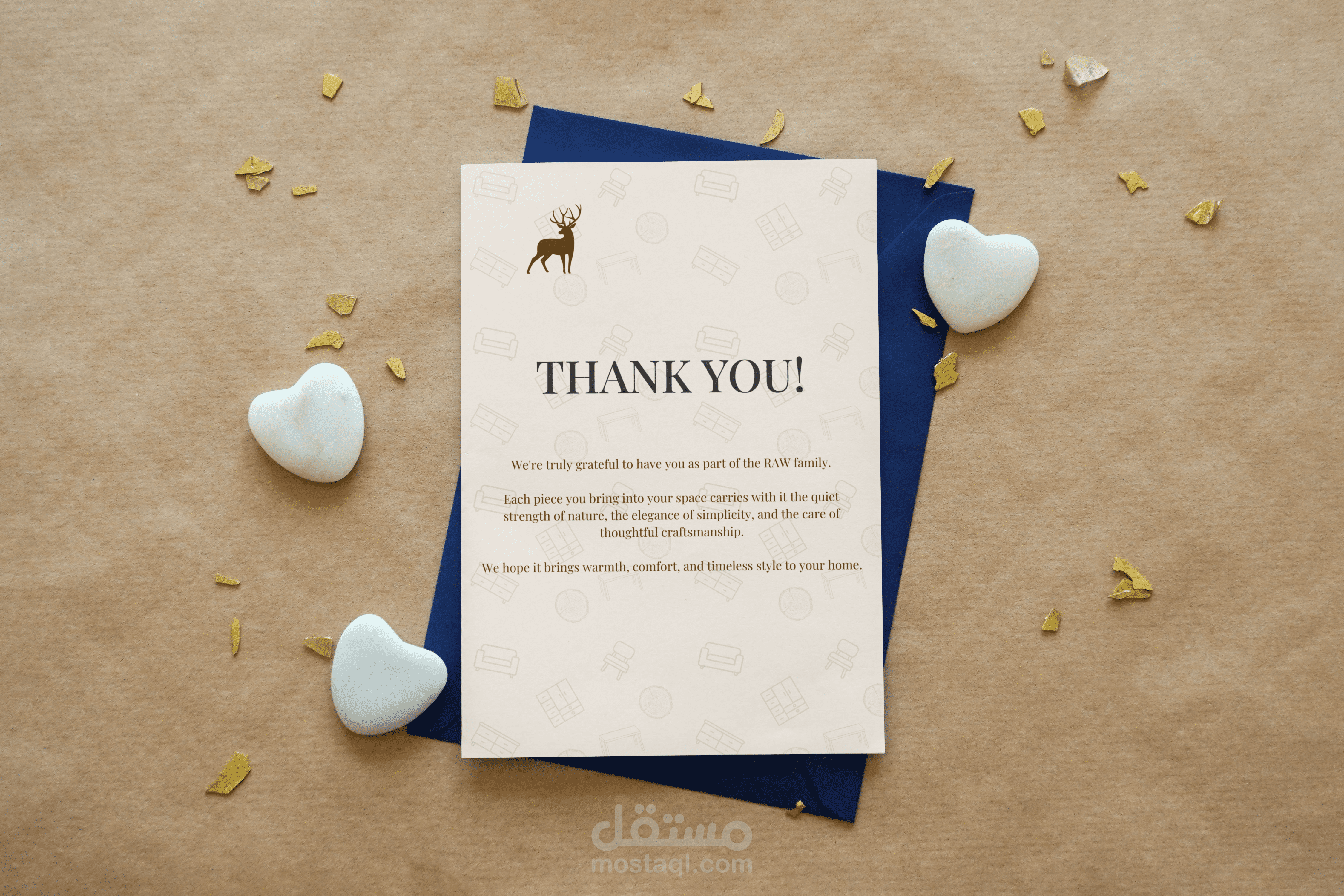 تم تصميم الهوية البصرية لبراند RAW لتعكس جوهر العلامة القائم على الهدوء، الرشاقة، والأصالة. اُختير رمز الغزالة في الشعار لما تحمله من معاني الأناقة الرشيقة والقوة الهادئة، وهي صفات تمثل روح الأثاث الذي يقدمه البراند—طبيعي، بسيط، ومتناغم مع محيطه. استخدمت درجات البيج، البني الخشبي، والنحاسي الناعم لتجسيد إحساس الدفء والفخامة الطبيعية، ولتعكس الخامات الخام التي يستوحي منها البراند فلسفته.