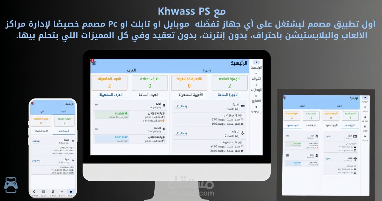 نظام Khwass PS هو تطبيق متكامل لإدارة محلات تأجير أجهزة البلايستيشن، مصمم خصيصاً لتلبية احتياجات أصحاب المحلات في إدارة الأجهزة، الحجوزات، العملاء، والمبيعات بكفاءة عالية. التطبيق متعدد المنصات ويعمل على الأجهزة المحمولة والأجهزة اللوحية وأجهزة الكمبيوتر.