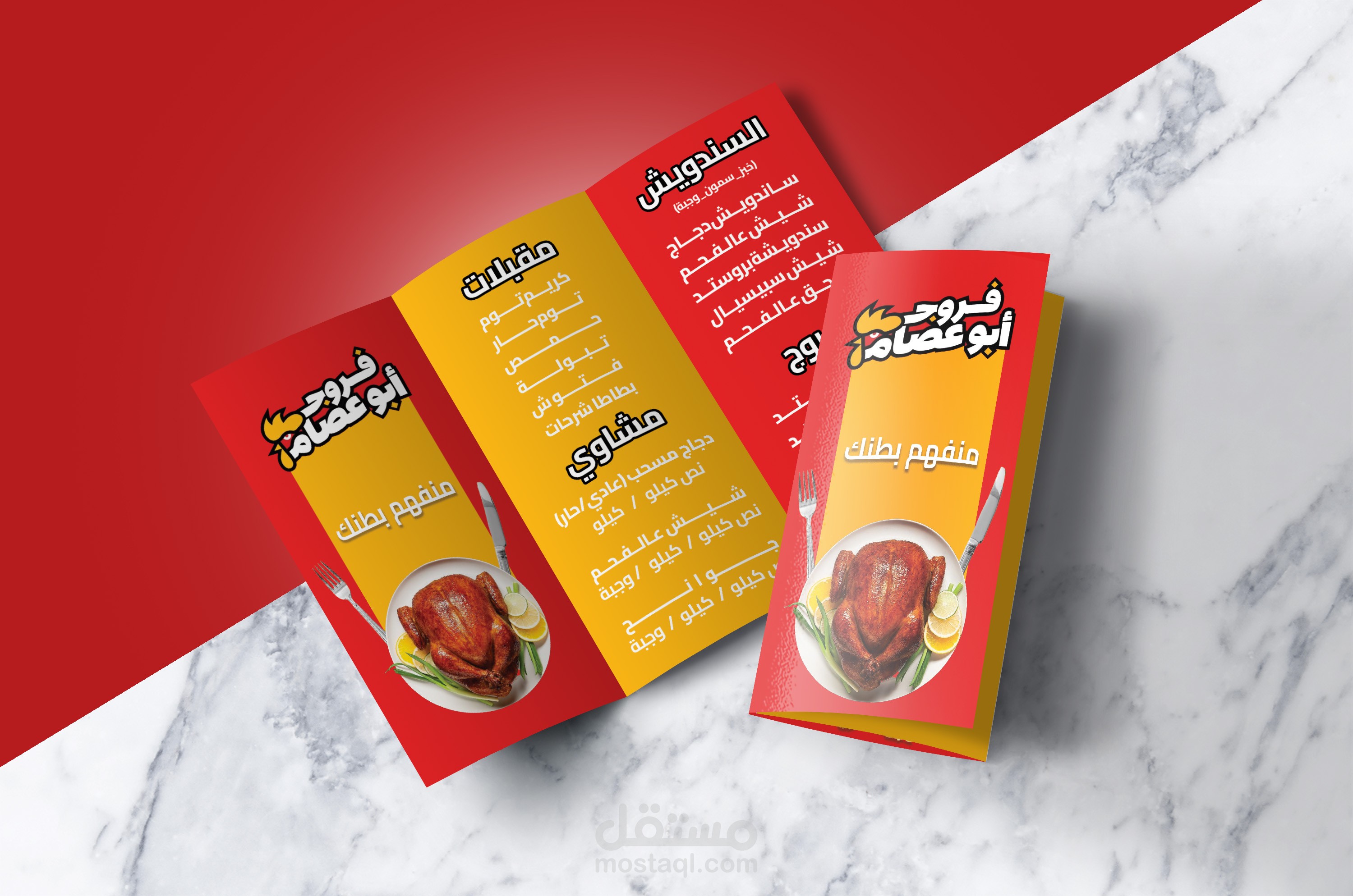 منيو مطعم فروج يتضمن الاصناف الموجودة ويراعي الهوية البصرية للمطعم بأسلوب متناسق
