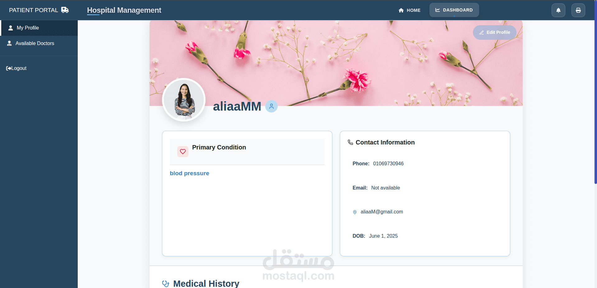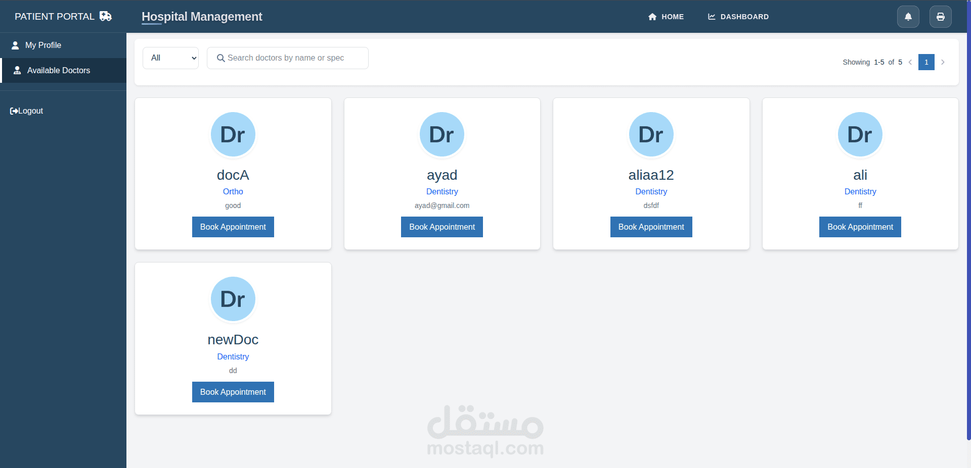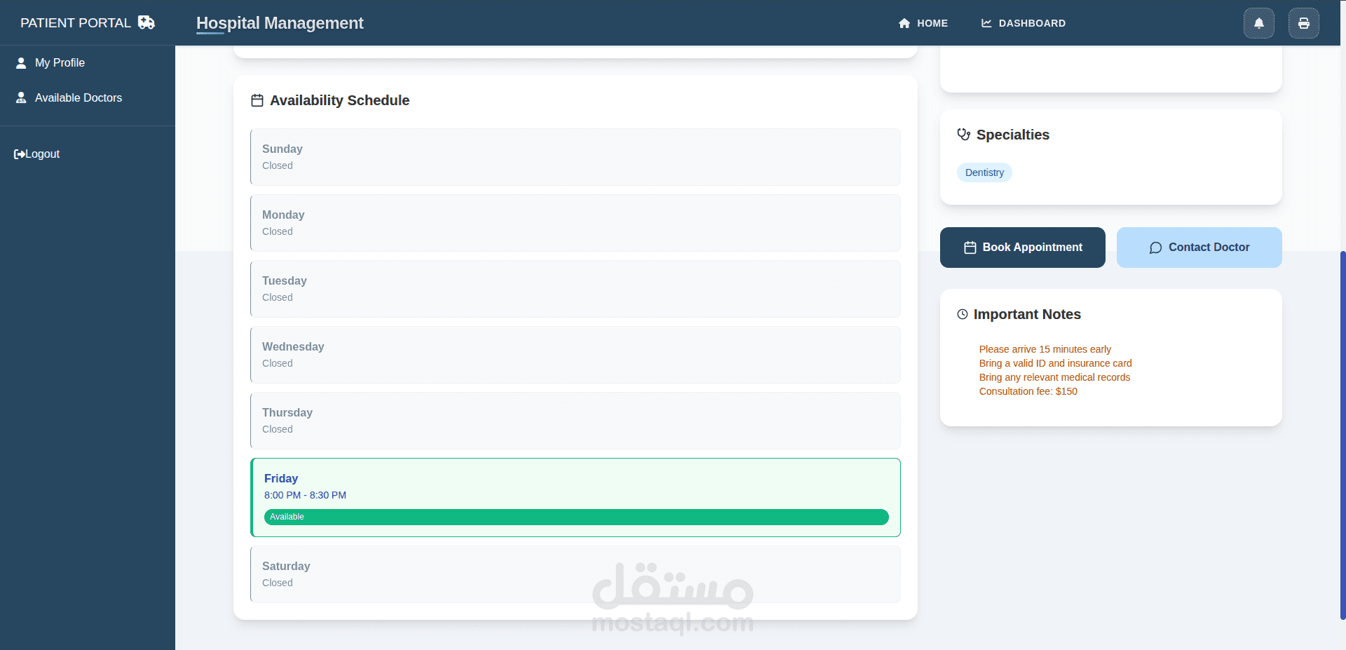 هذا الموقع هو اداره لمستشفي يوجد بيه العديد من الاطباء بالتخصصات المختلفه ويستطيع المرضي التسجيل ورؤيه المواعيد المتاحه لكل طبيب وايا التسجيل معهم وقبل الميعاد يتم تنبيه المريض عن طريق الاشعارات بان الميعاد مع الطبيب اقترب وايضا يستطيع الطبيب ان يقبل او يرفض المواعيد
