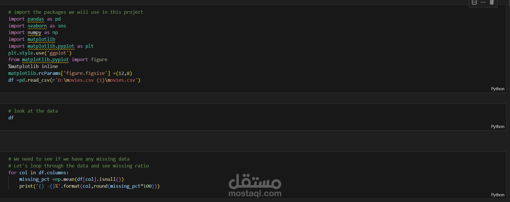 استيراد البيانات والتحقق الأولي: يتم استيراد بيانات الأفلام والقيام بفحص سريع للبيانات، بما في ذلك التحقق من القيم المفقودة وأنواع البيانات.