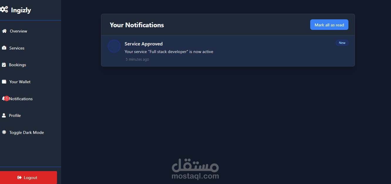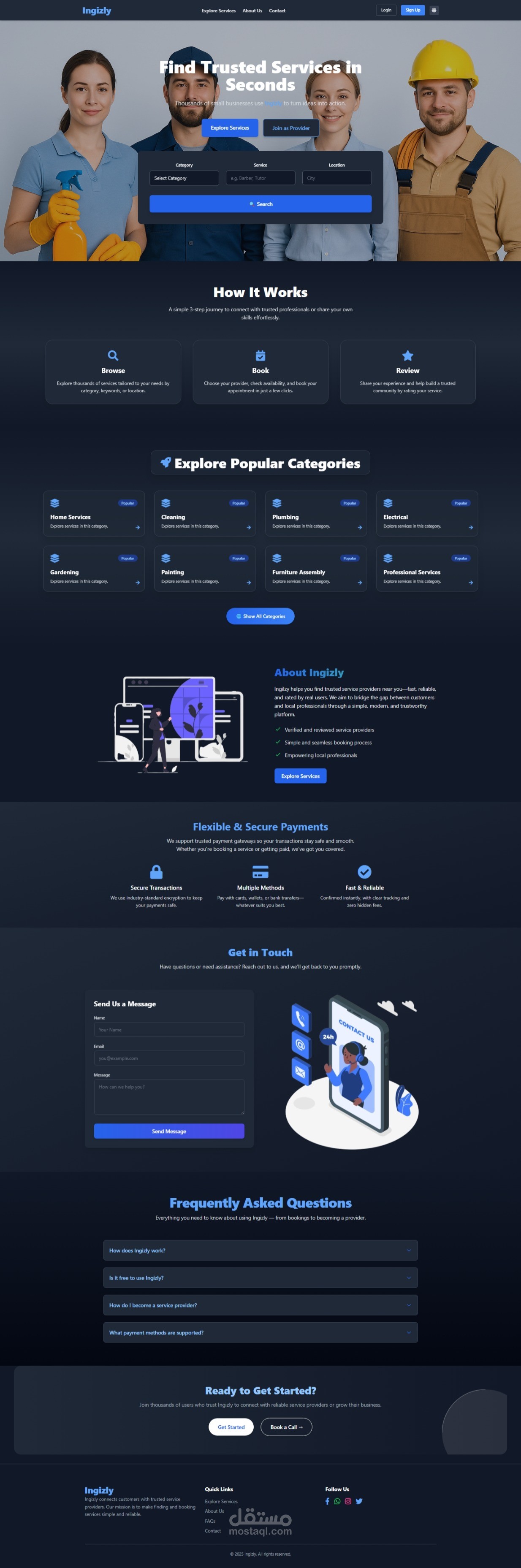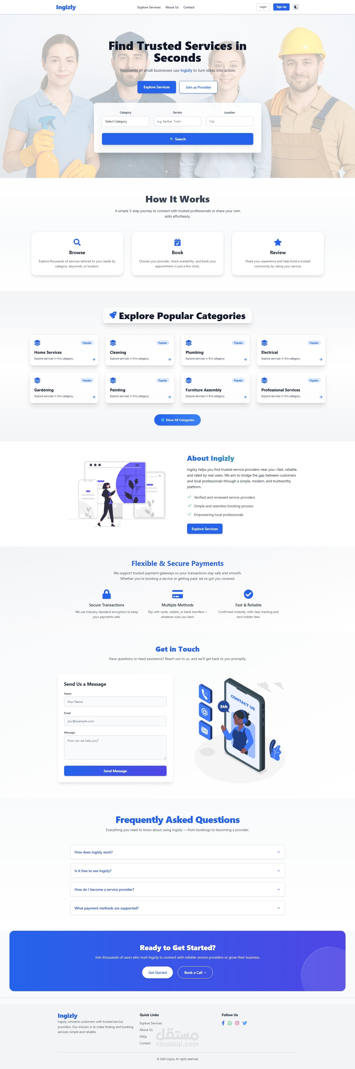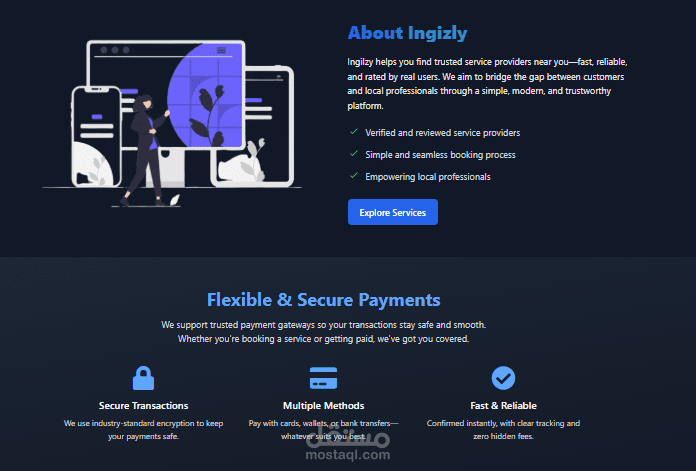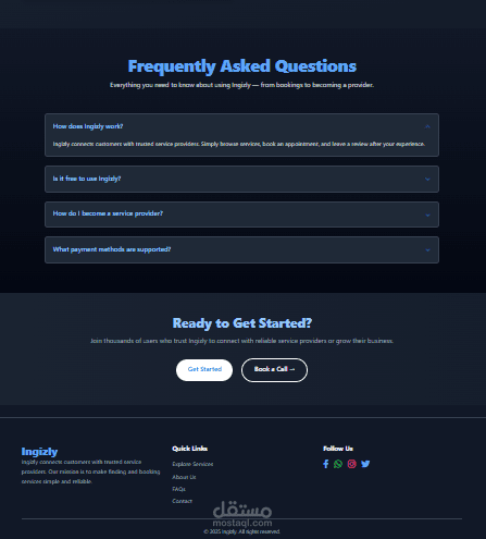 Ingizly هو منصة إلكترونية متكاملة مبنية باستخدام Laravel، تهدف إلى ربط مقدمي الخدمات بالعملاء في مختلف المجالات مثل الخدمات المنزلية، التعليم، التصميم، التسويق الرقمي، وغيرها. تتيح المنصة للمستخدمين عرض الخدمات، حجزها، والتواصل بين الأطراف بكل سهولة وأمان.