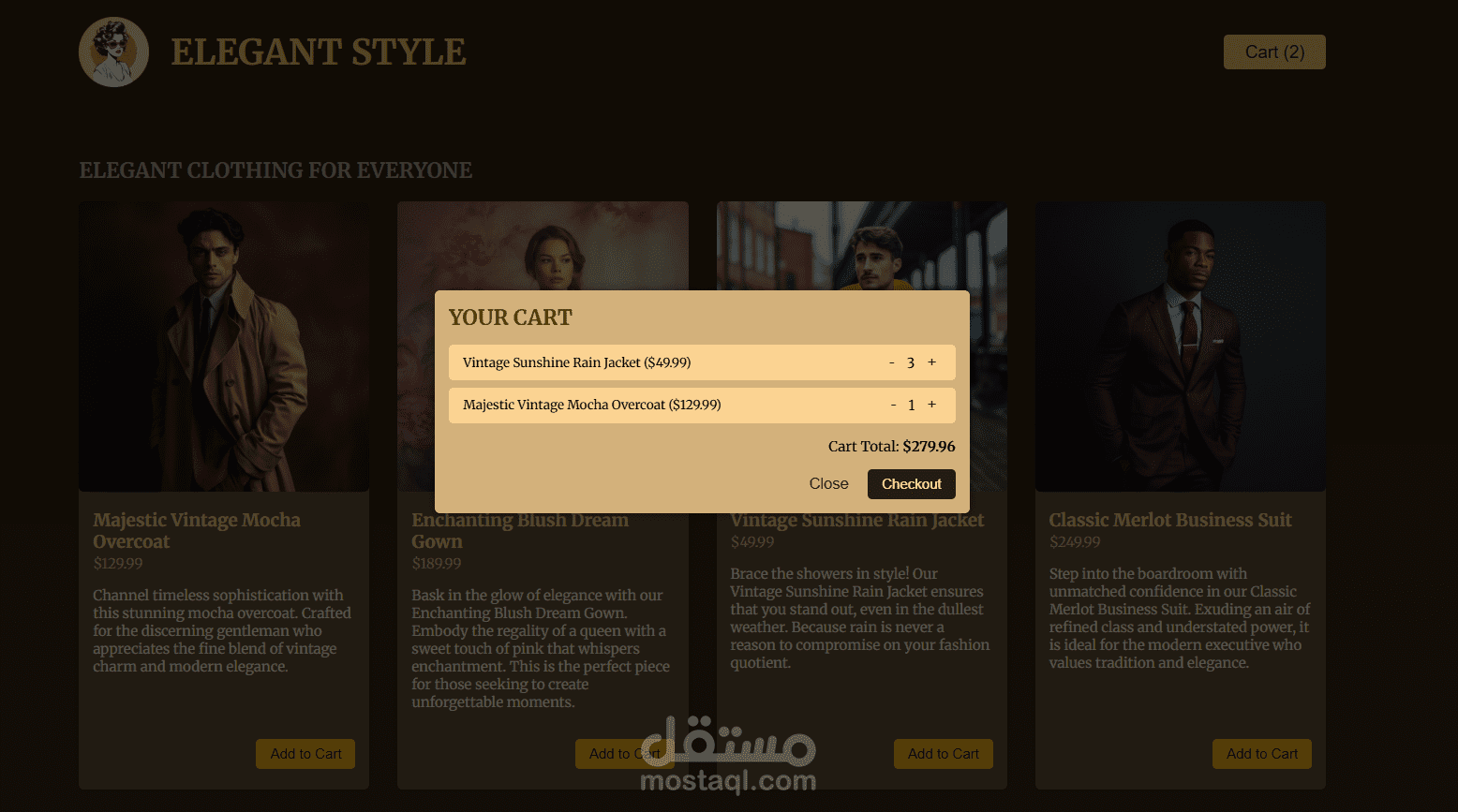 Elegant Style هو متجر إلكتروني لبيع الملابس، تم تطويره باستخدام React وVite مع دمج Tailwind CSS لتصميم واجهات عصرية وسريعة الاستجابة (Responsive).