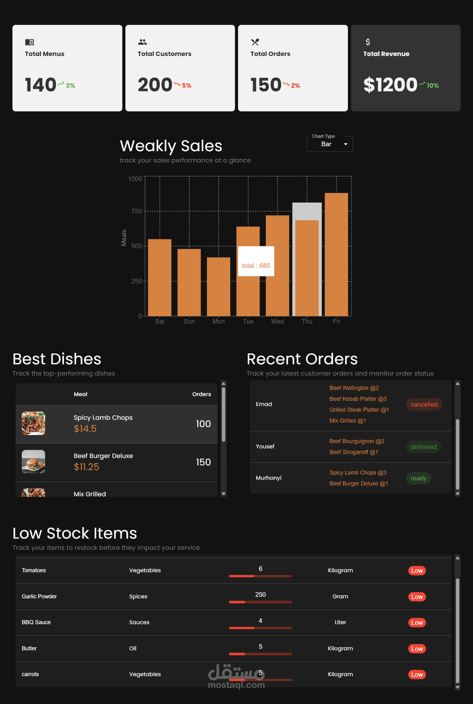 نظام إدارة مطاعم متكامل تم تصميمه خصيصًا للمطاعم المتخصصة في تقديم اللحوم، يهدف إلى تسهيل العمليات اليومية وتحسين تجربة الإدارة. يشمل النظام لوحة تحكم تفاعلية تعرض البيانات في الوقت الفعلي، ونظامًا مرنًا لإدارة الطلبات، بالإضافة إلى تحليلات دقيقة تساعد أصحاب المطاعم على اتخاذ قرارات مبنية على بيانات، مما يساهم في رفع الكفاءة وزيادة الأرباح.