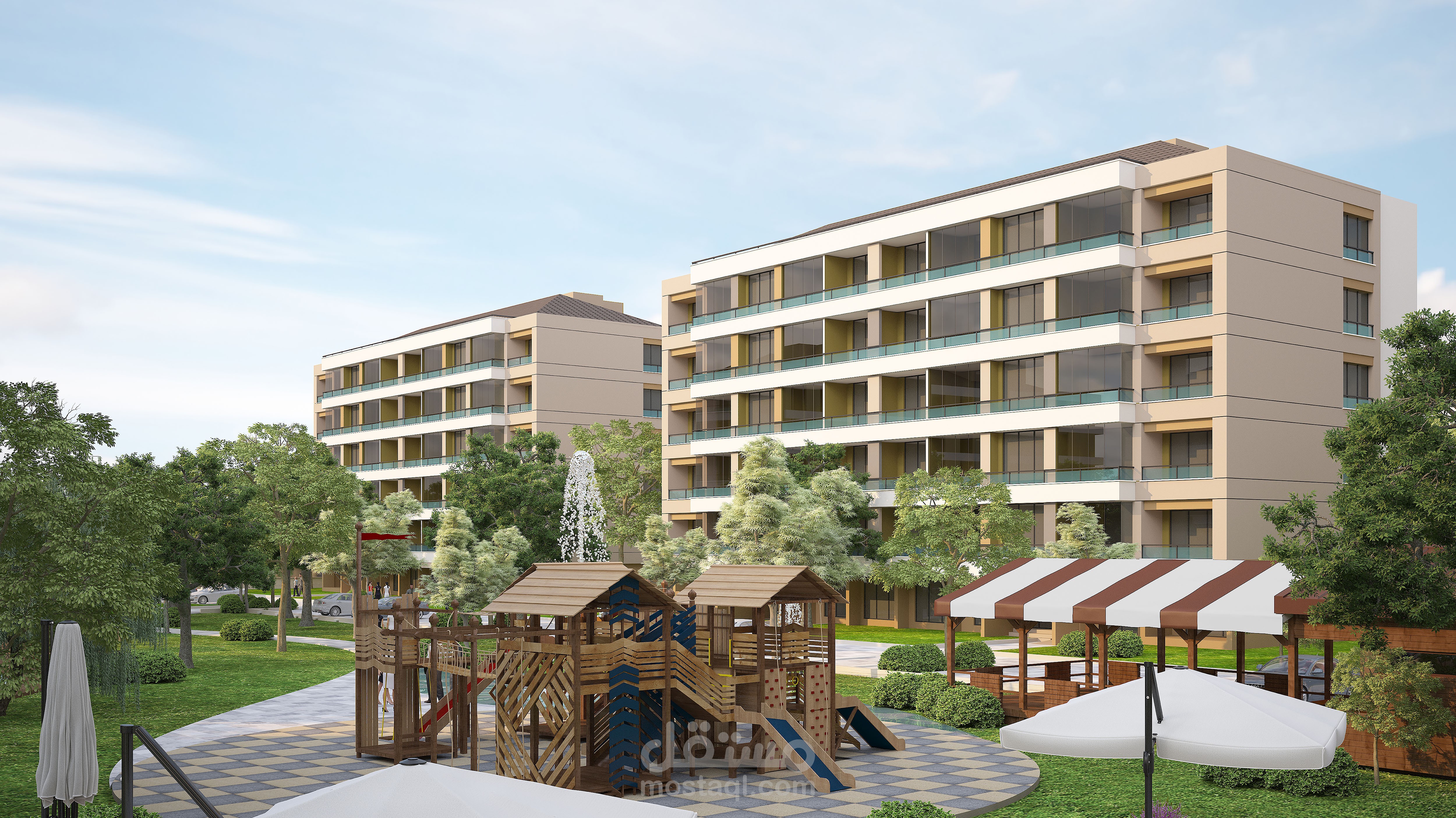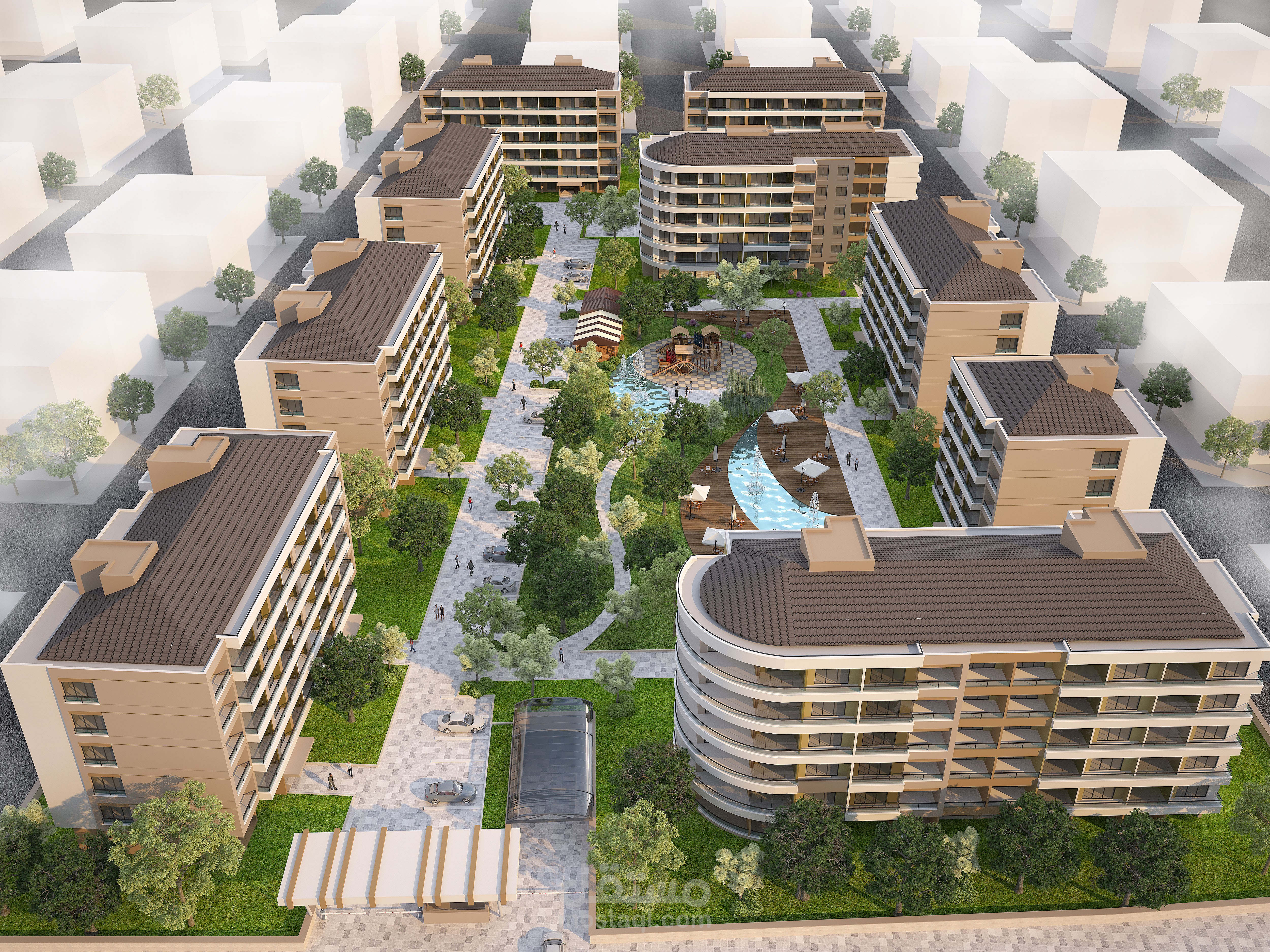 مشروع مدينة سكنية عبارة عن 9 أبنية تحيط بفراغات مشتركة (حديقة- مكان للعب الأطفال- كافيتيريا)