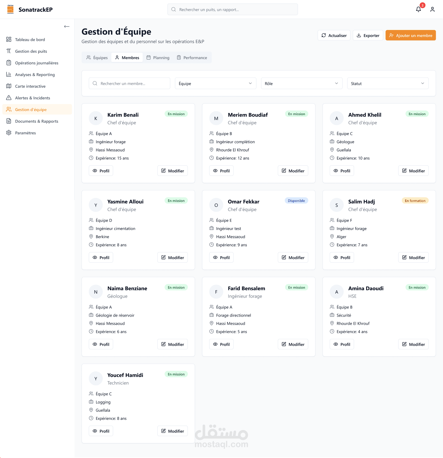 قائمة جانبية للتنقل بين الصفحات (لوحة القيادة، إدارة الآبار، العمليات اليومية، التحليلات والتقارير، الخريطة التفاعلية، الإنذارات، إدارة الفريق، الوثائق والتقارير، الإعدادات).