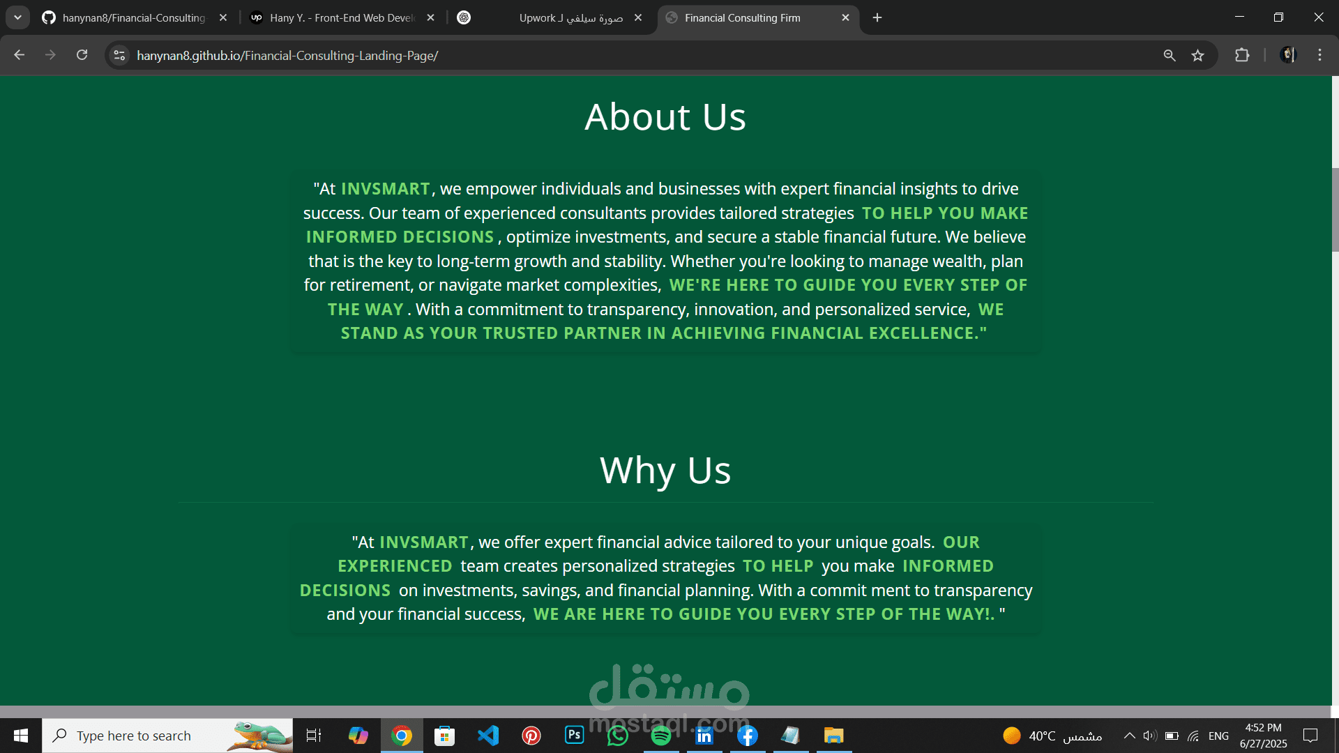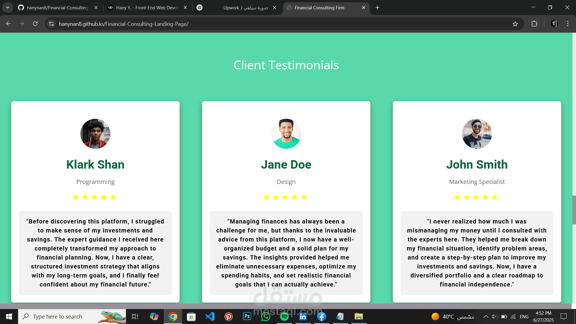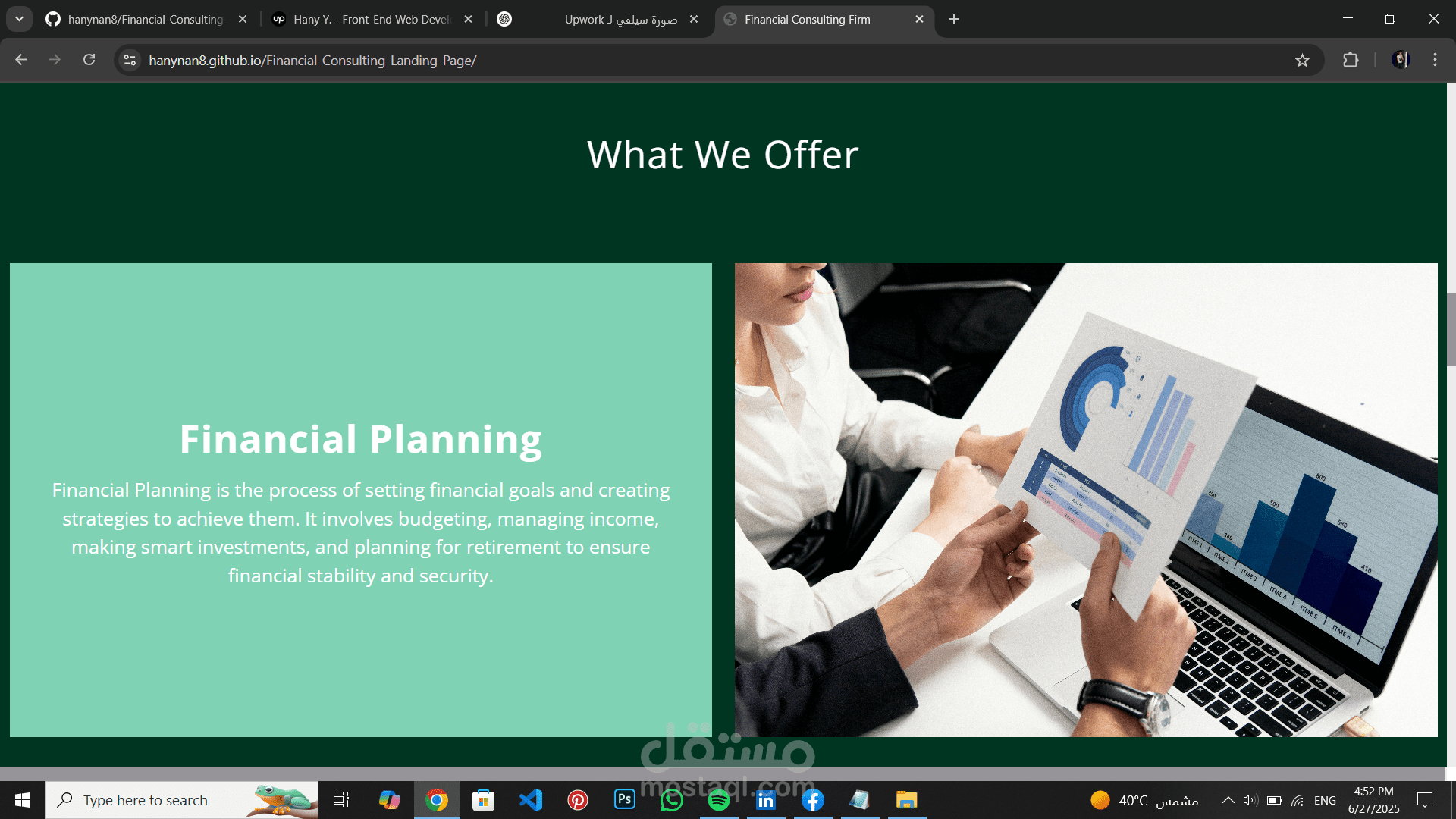 تصميم صفحة هبوط متعددة الأقسام بشكل احترافي لخدمة الاستشارات المالية، باستخدام HTML5 وCSS3 وJavaScript النقي (Vanilla JS)، بالإضافة إلى إطار Bootstrap لتعزيز الاستجابة وسهولة التوافق مع جميع أحجام الشاشات. ركز التصميم على توفير تجربة مستخدم متجاوبة وسلسة، مع إبراز نقاط القوة والخدمات الرئيسية، بالإضافة إلى نموذج تواصل مخصص بتصميم فريد يسهل التواصل مع العملاء بشكل فعال.