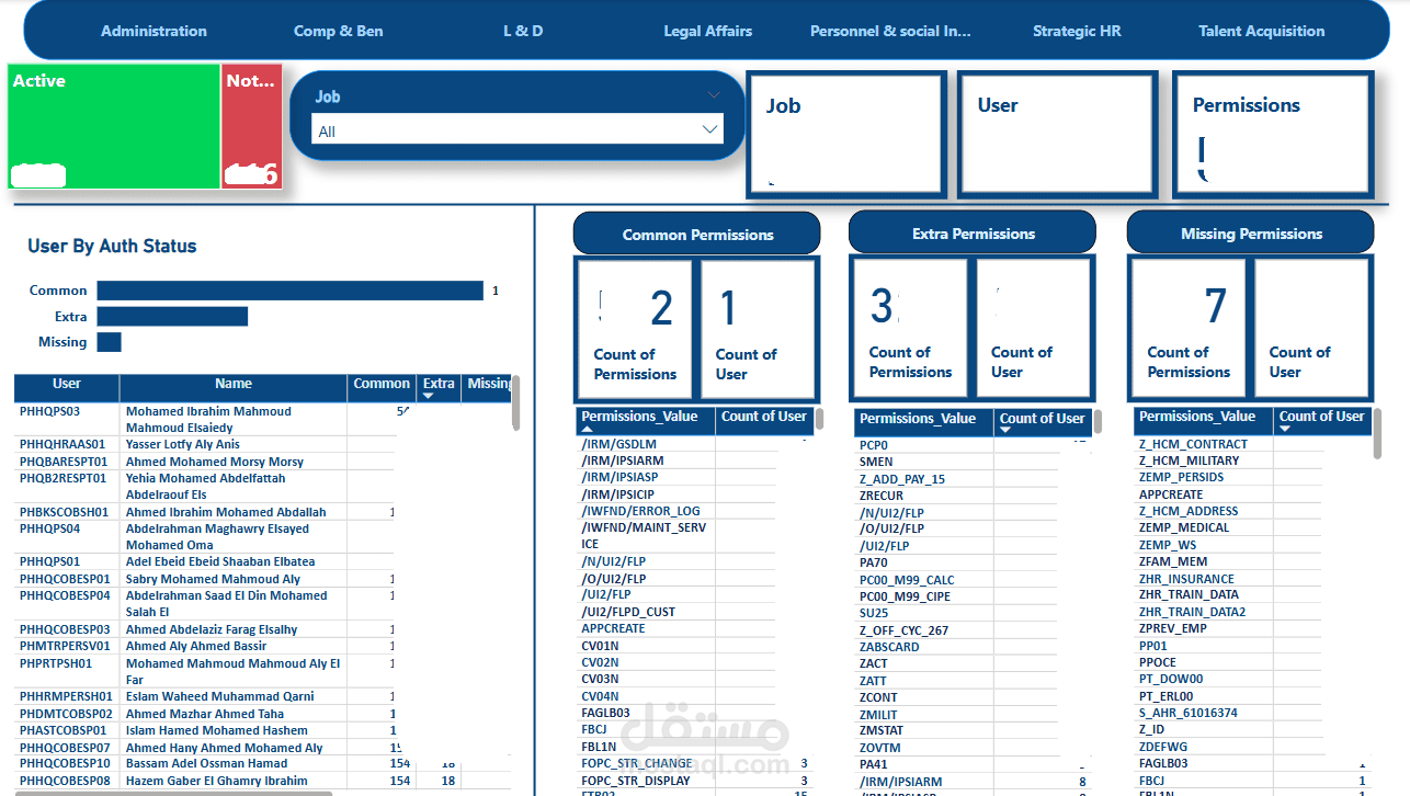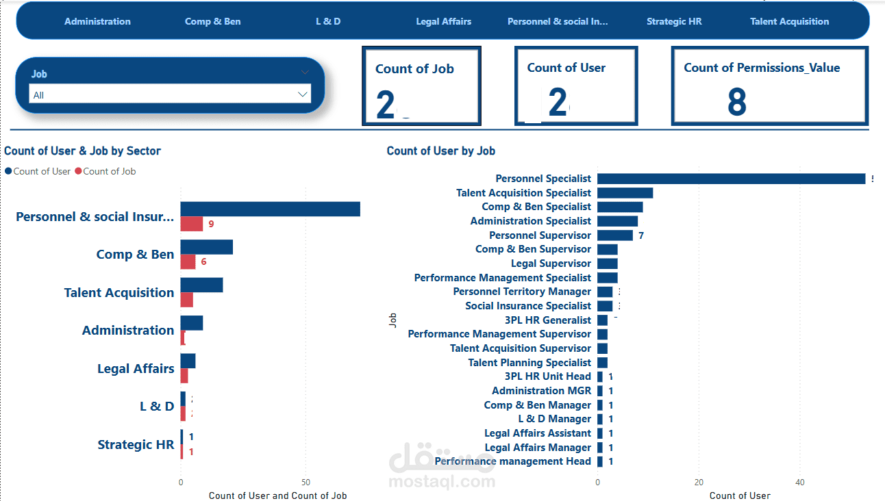 Dashboard لتحليل بيانات صلاحيات الموظفين في ادارة الموارد البشريه علي مستوي الاقسام والوظيفة