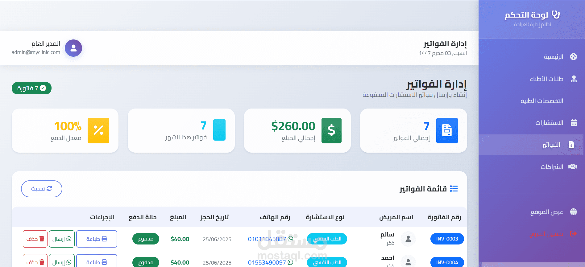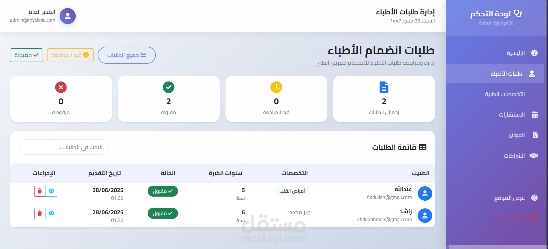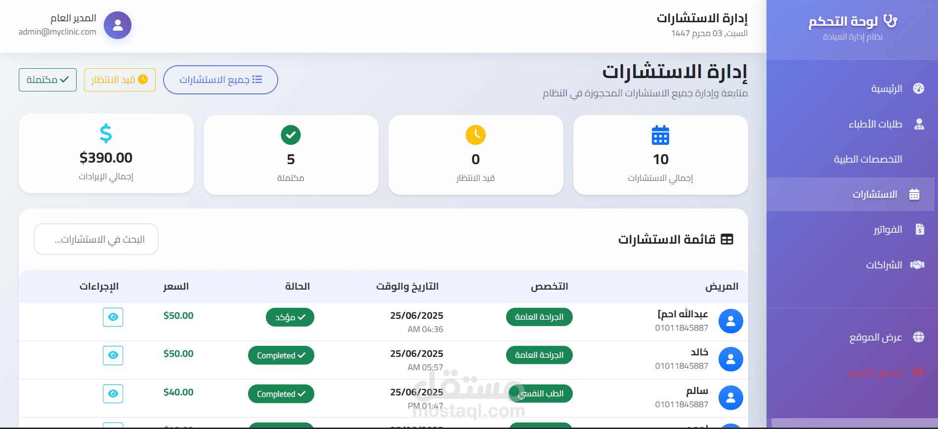 مشروع خاص لادارة العيادة من حيث استشارات وحجز مواعيد المرضي وايضا الانضمام للطاقم الطبي الخاص بالعيادة مع وجود لوحة تحكم Dashboard لادارة الموقع بشكل كامل وعمليات الدفع والموافقة علي الانضمام للطاقم الطبي وتحديد مواعيد الاستشارات مع وجود قاعدة بيانات SQL Server