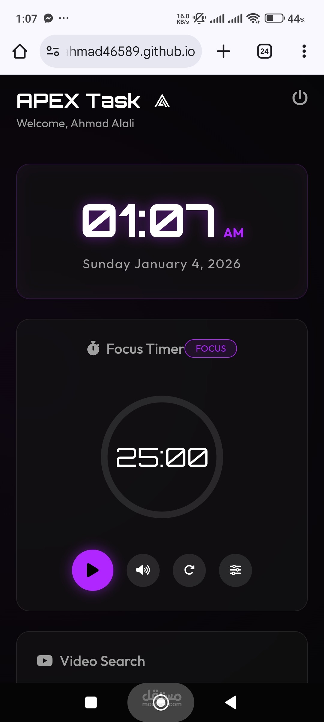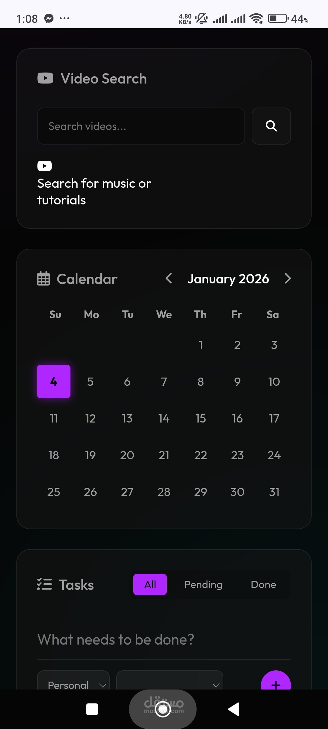 تقسيم منطقي للأقسام الرئيسية (Timer، بحث، تقويم، مهام)