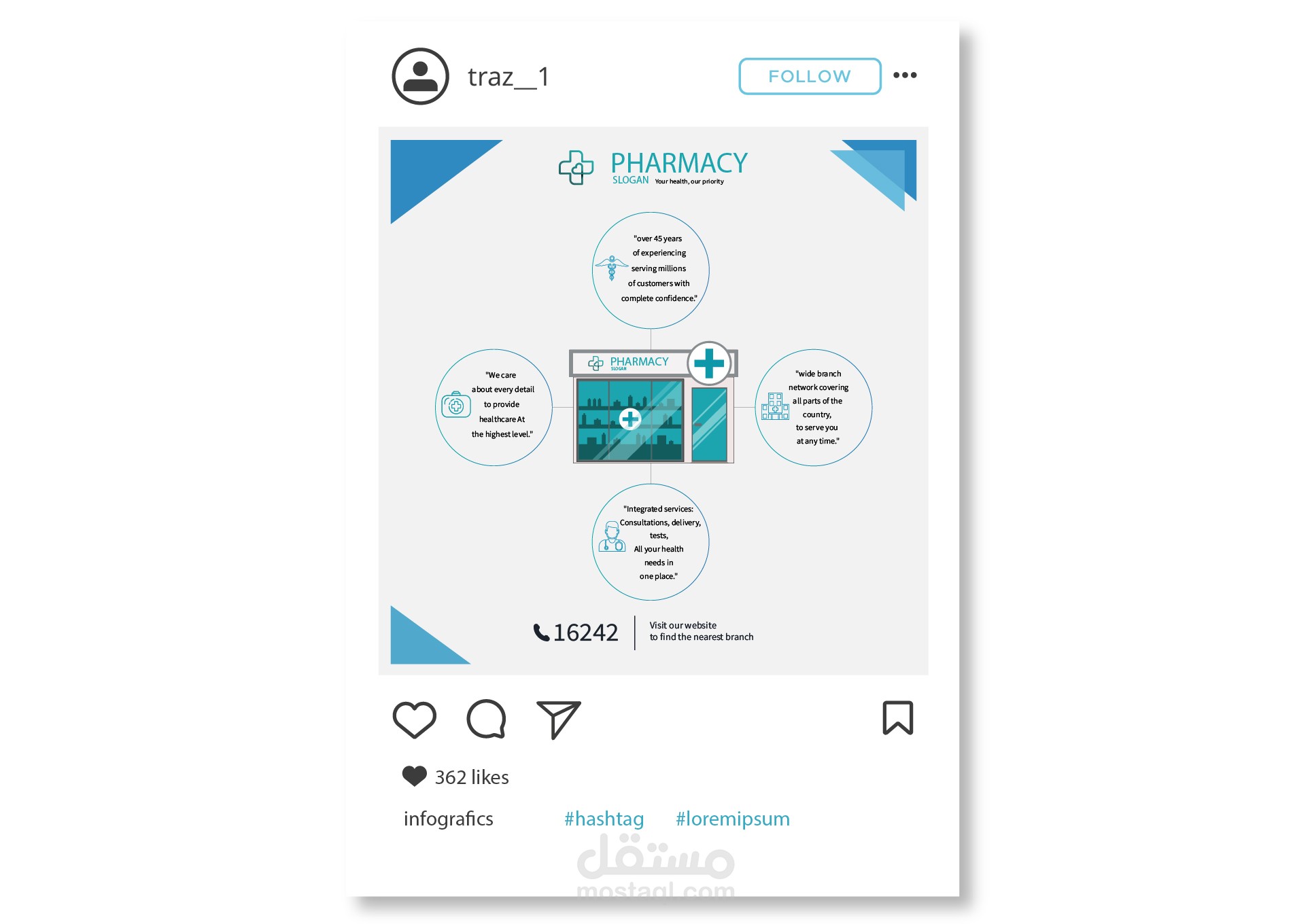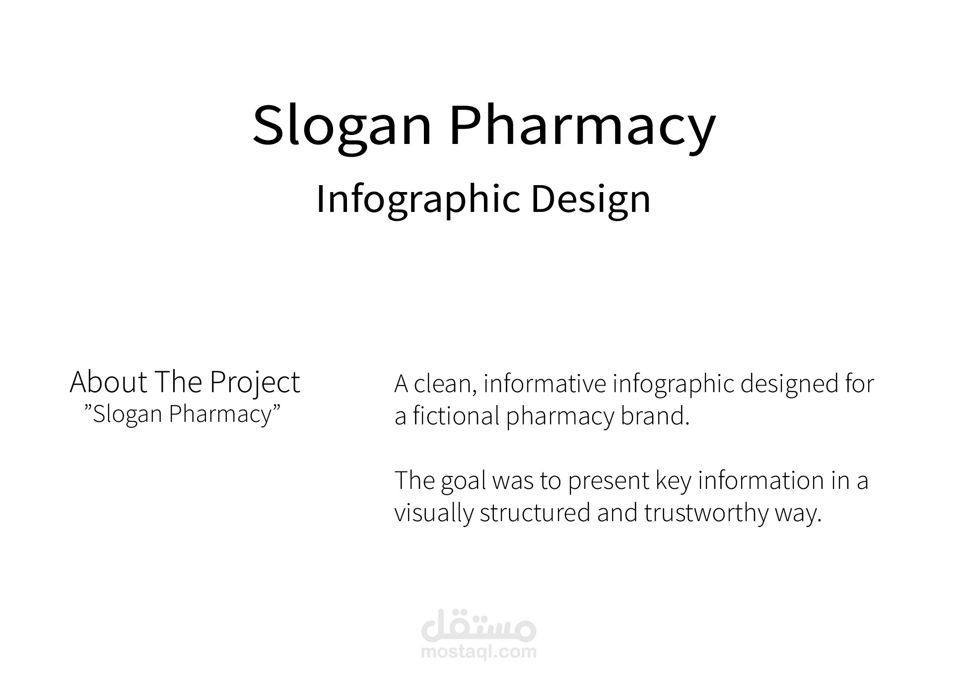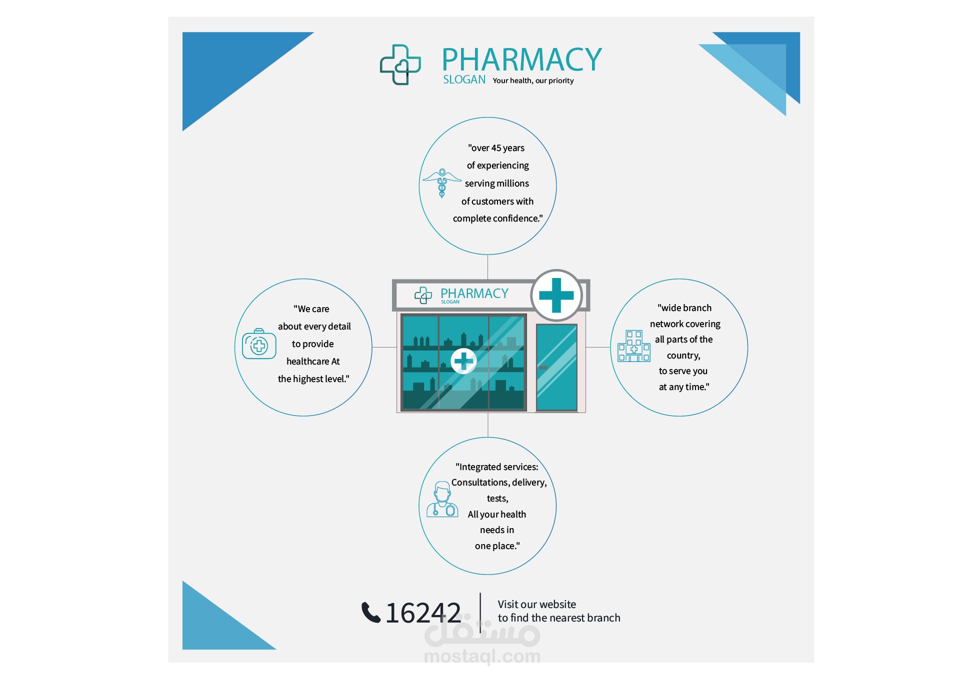 تصميم منشور إعلاني لسوشيال ميديا لصيدلية افتراضية باسم "SLOGAN Pharmacy" عن طريق نوع من العرض اسمه الانفوجرافيك ، بأسلوب احترافي ونظيف يعكس الثقة والطابع الطبي.
