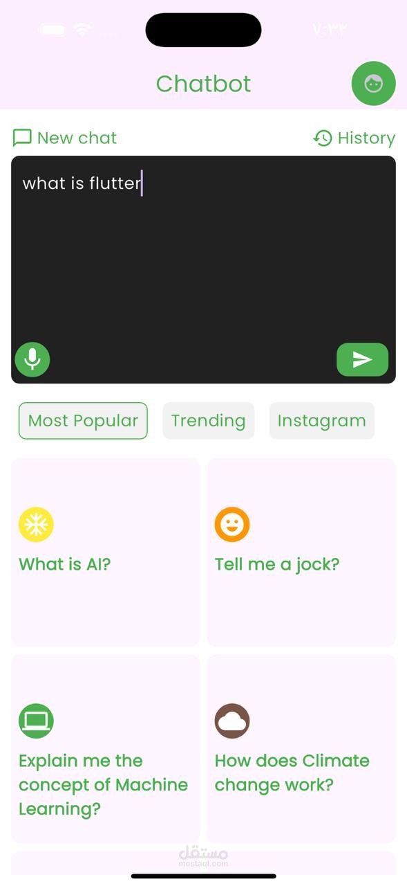 A Flutter-based Chat Bot application with animated responses using AnimatedTextKit. The app integrates AI-generated responses and supports real-time messaging with a clean UI.