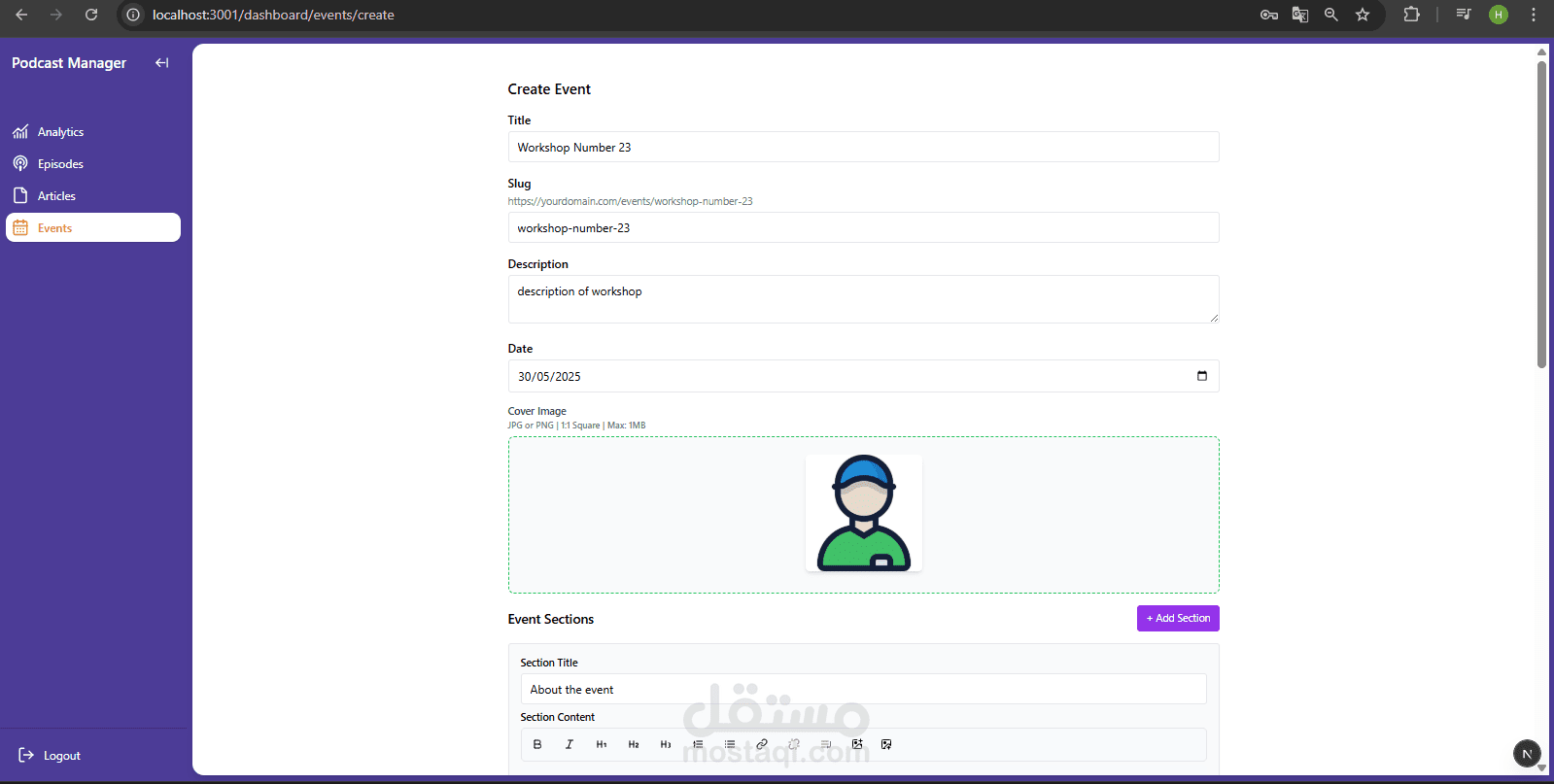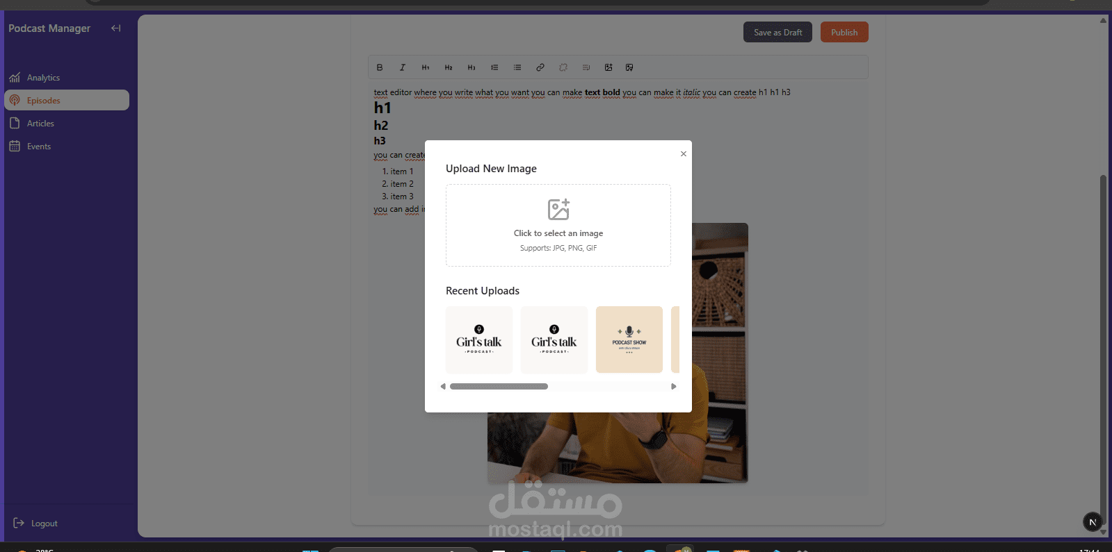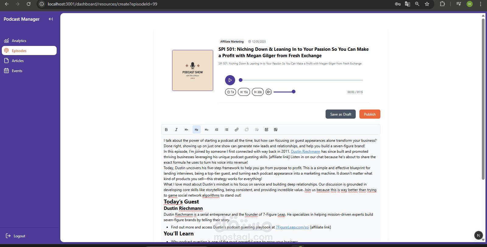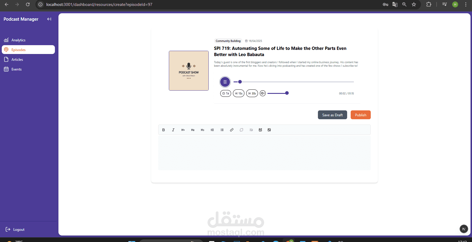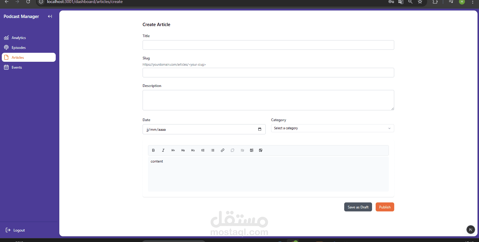 One of my recent projects involved developing an admin panel for the blog of a podcaster and public speaker. The platform is designed to manage podcast episodes, upcoming events, and blog articles—all from a single, intuitive admin interface.
