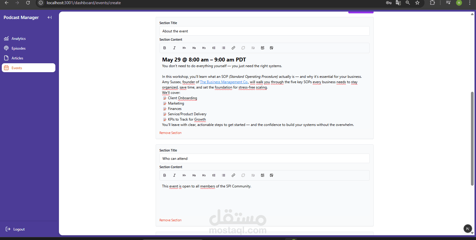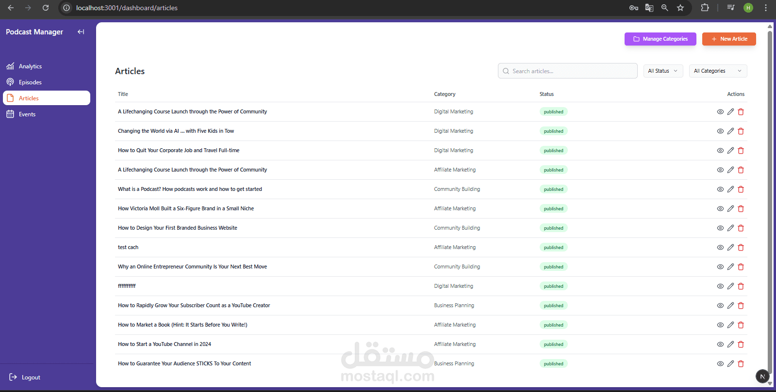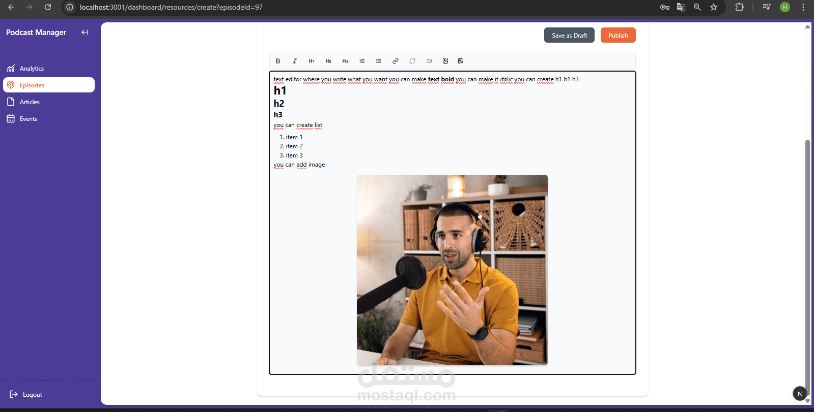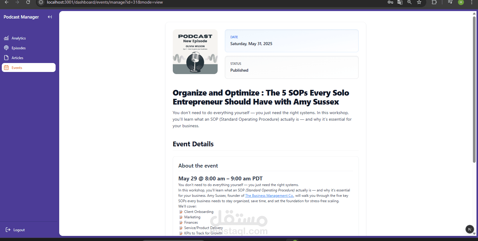 One of my recent projects involved developing an admin panel for the blog of a podcaster and public speaker. The platform is designed to manage podcast episodes, upcoming events, and blog articles—all from a single, intuitive admin interface.