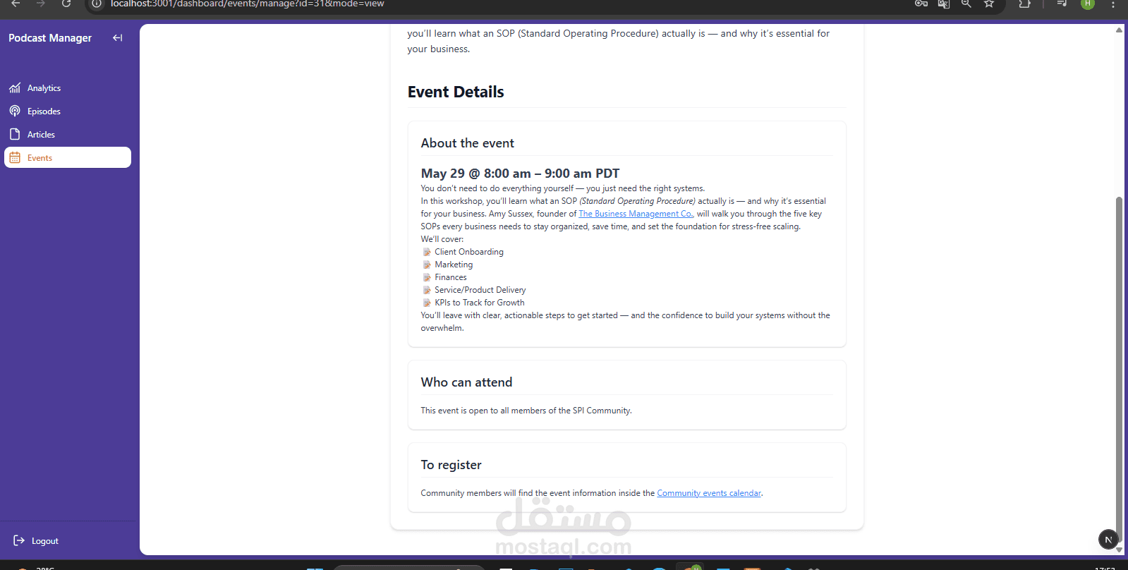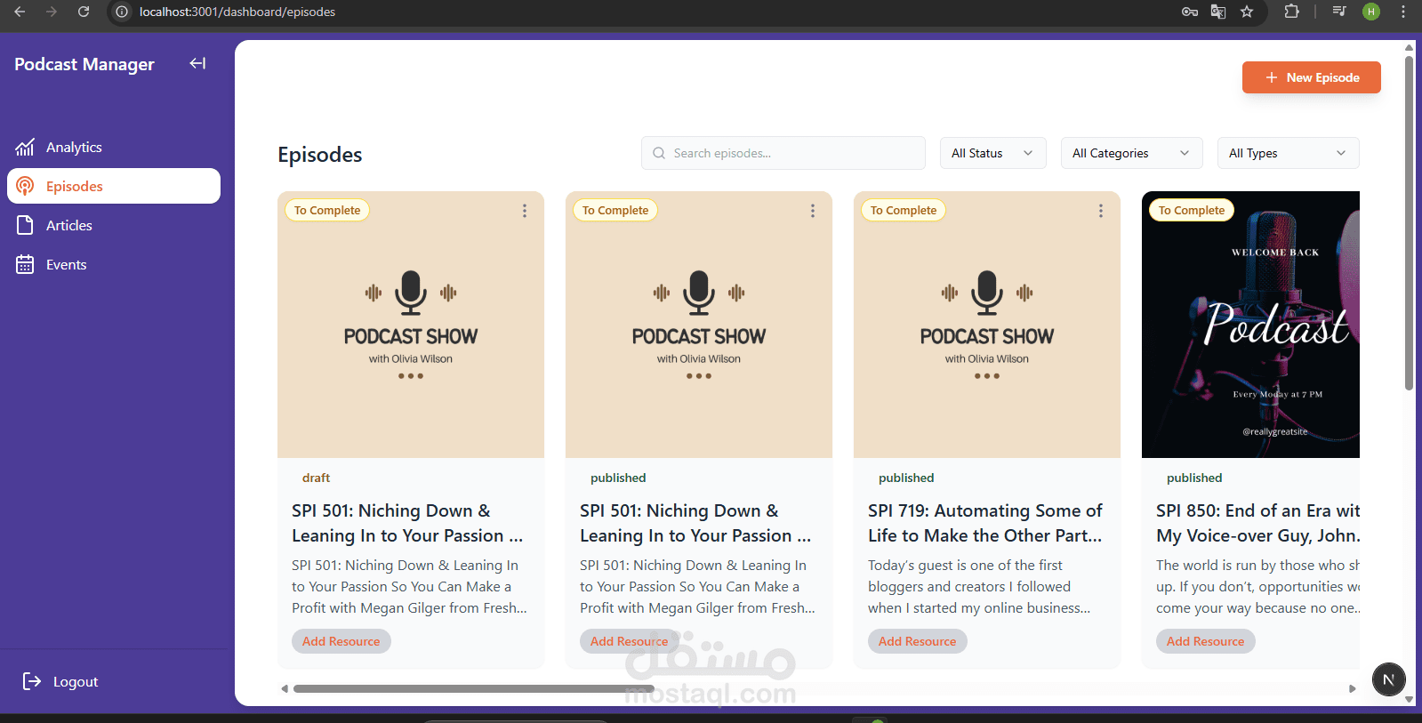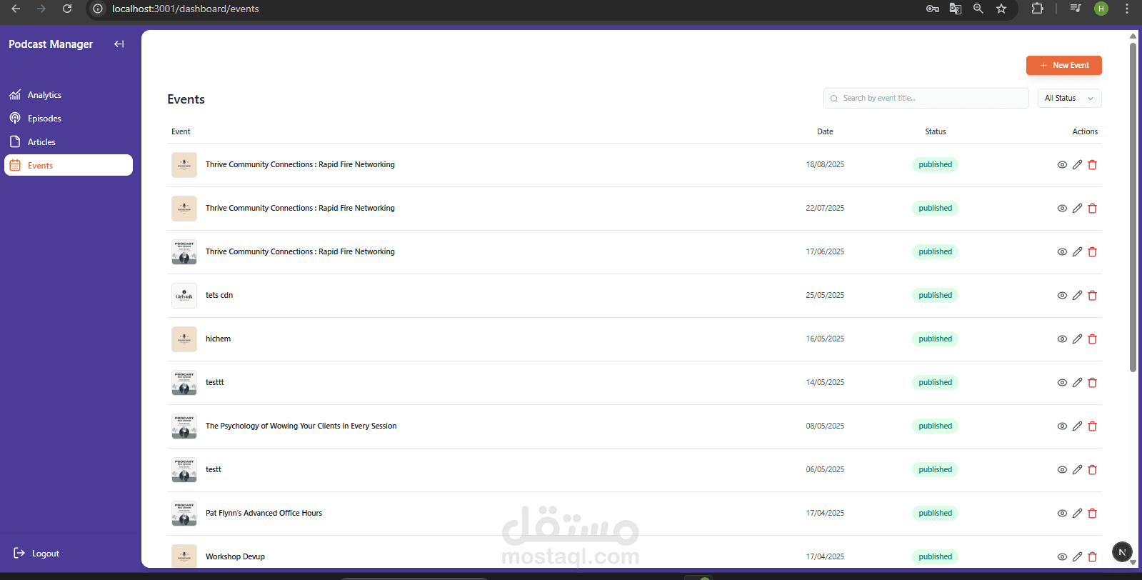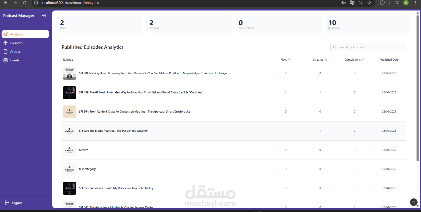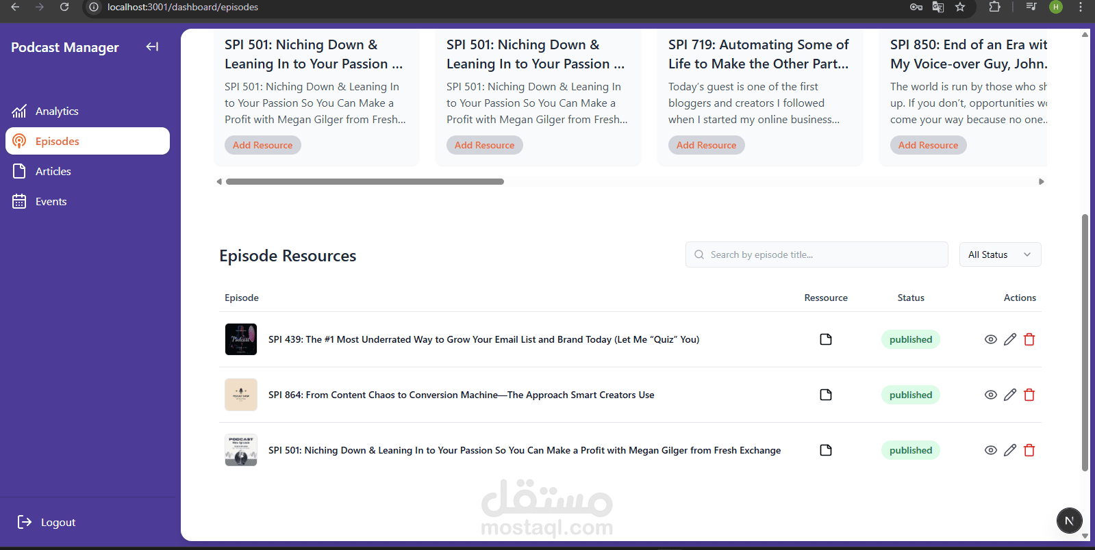 One of my recent projects involved developing an admin panel for the blog of a podcaster and public speaker. The platform is designed to manage podcast episodes, upcoming events, and blog articles—all from a single, intuitive admin interface.