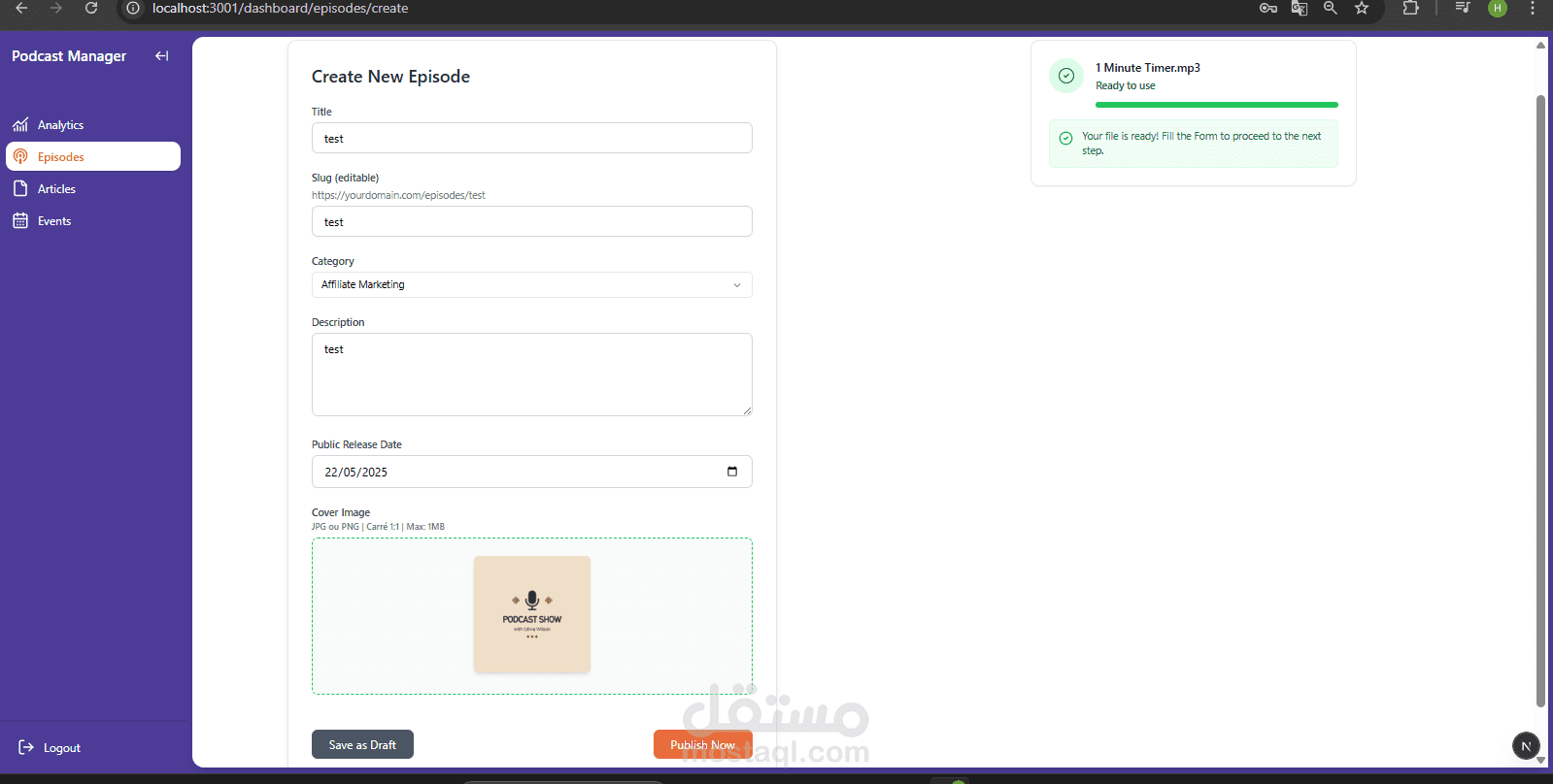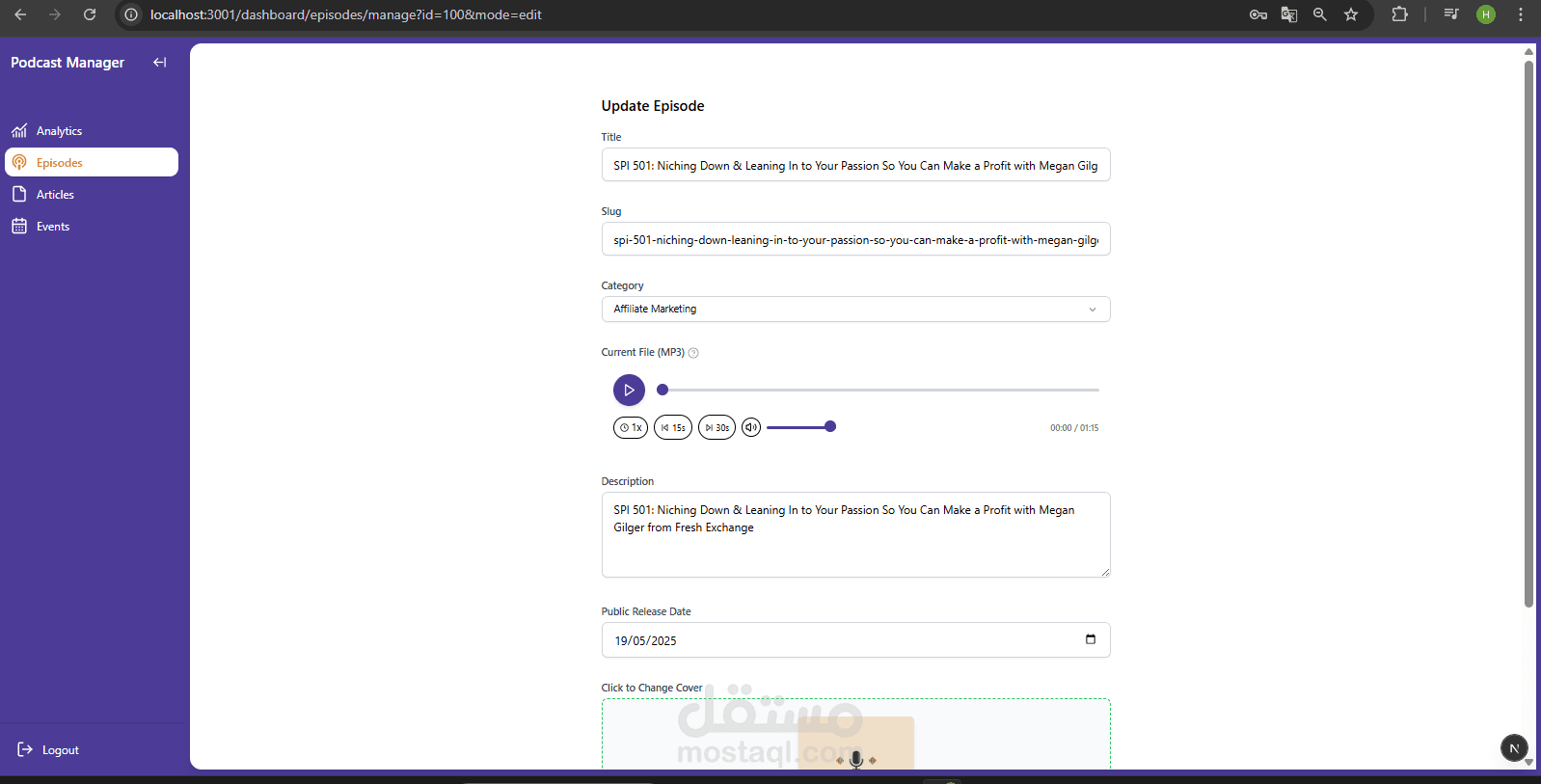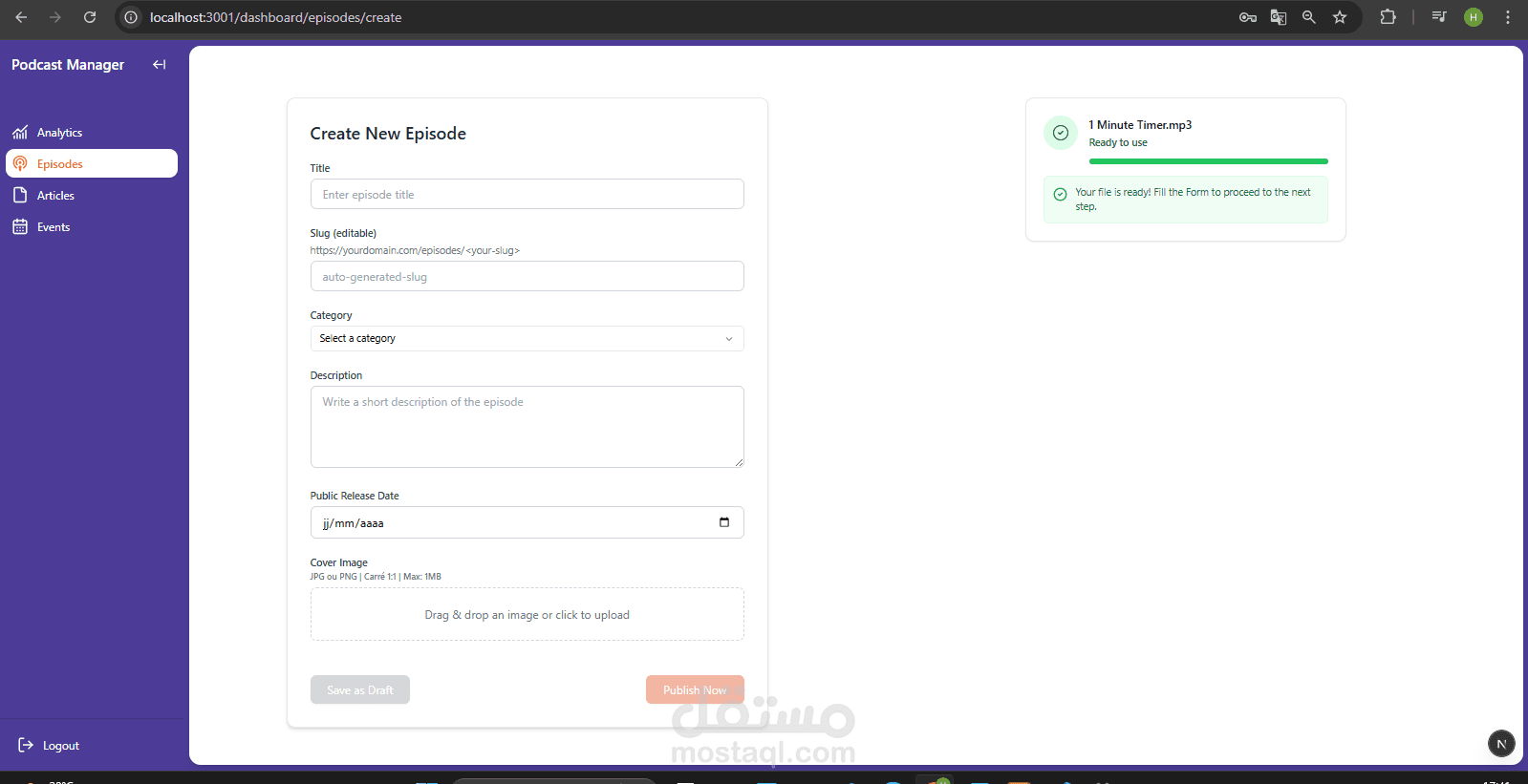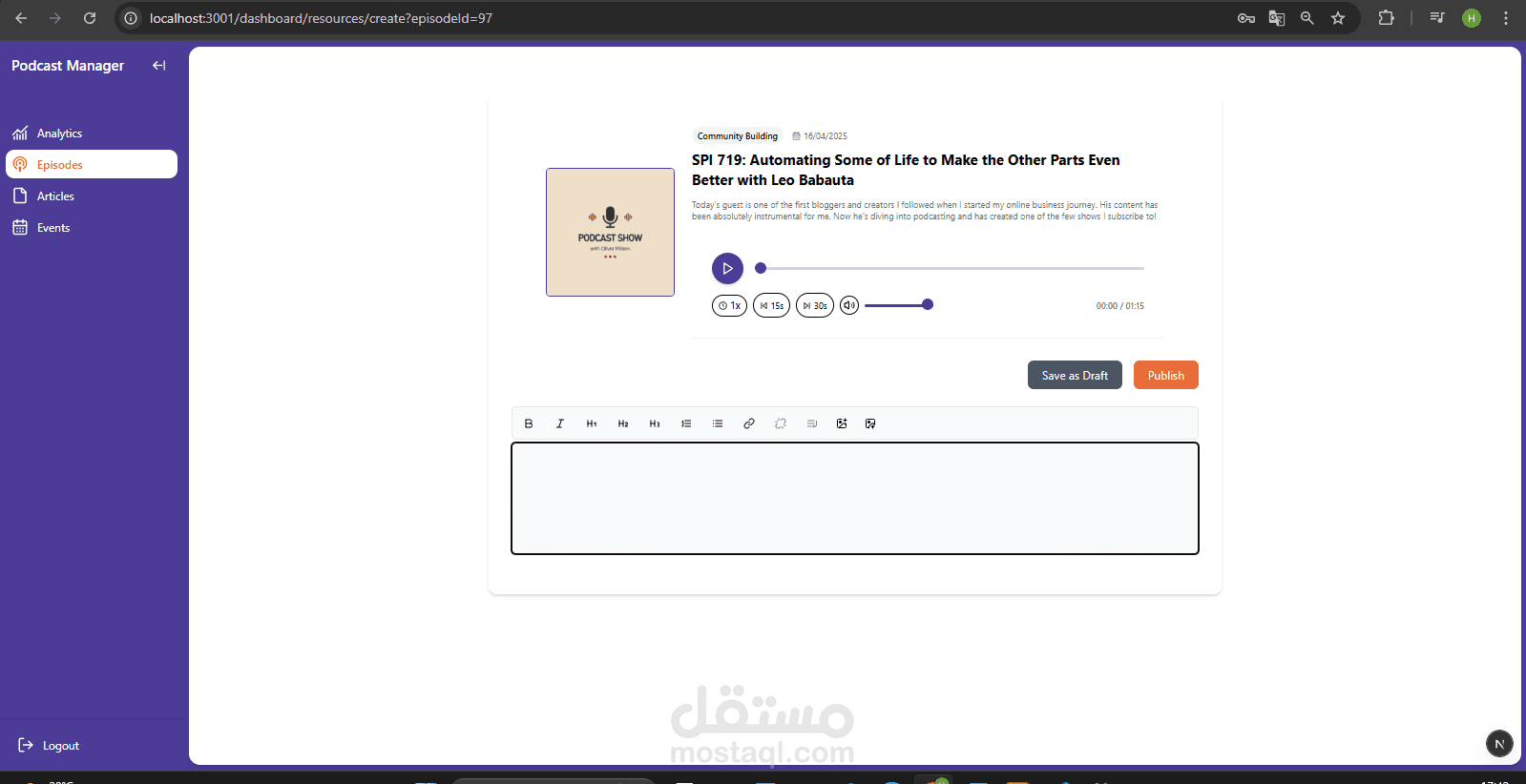 The project uses DigitalOcean's S3-compatible object storage to host podcast episode files in MP3 format. The admin can manage each episode's title, description, and slug (which defines the podcast's URL on the blog), providing full control over SEO.