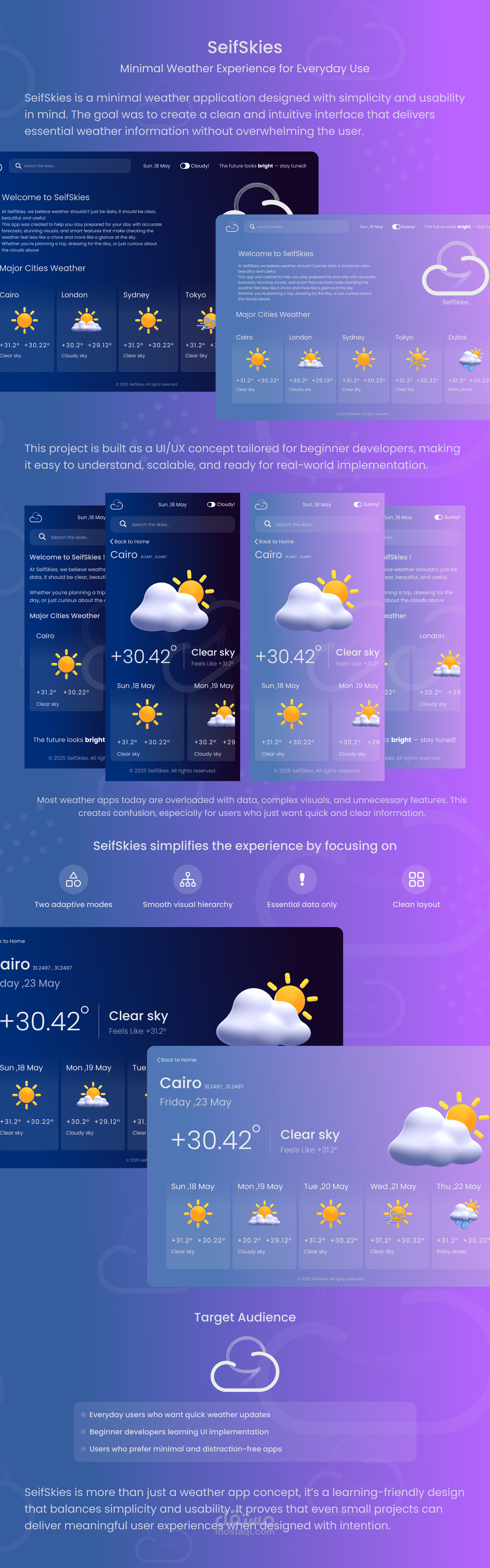 SeifSkies هو تطبيق عصري لمتابعة حالة الطقس والأحوال الجوية، تم تصميمه بعناية على منصة Figma مع مراعاة تجربة المستخدم ووضوح المعلومات.