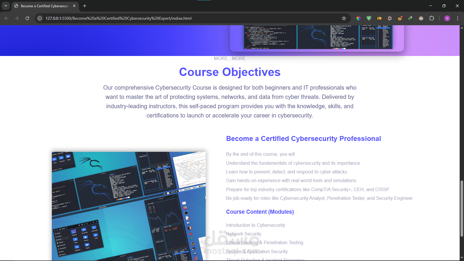 صممت هذه الصفحة كصفحة هبوط (Landing Page) لدورة تدريبية بعنوان "Become a Certified Cybersecurity Expert".