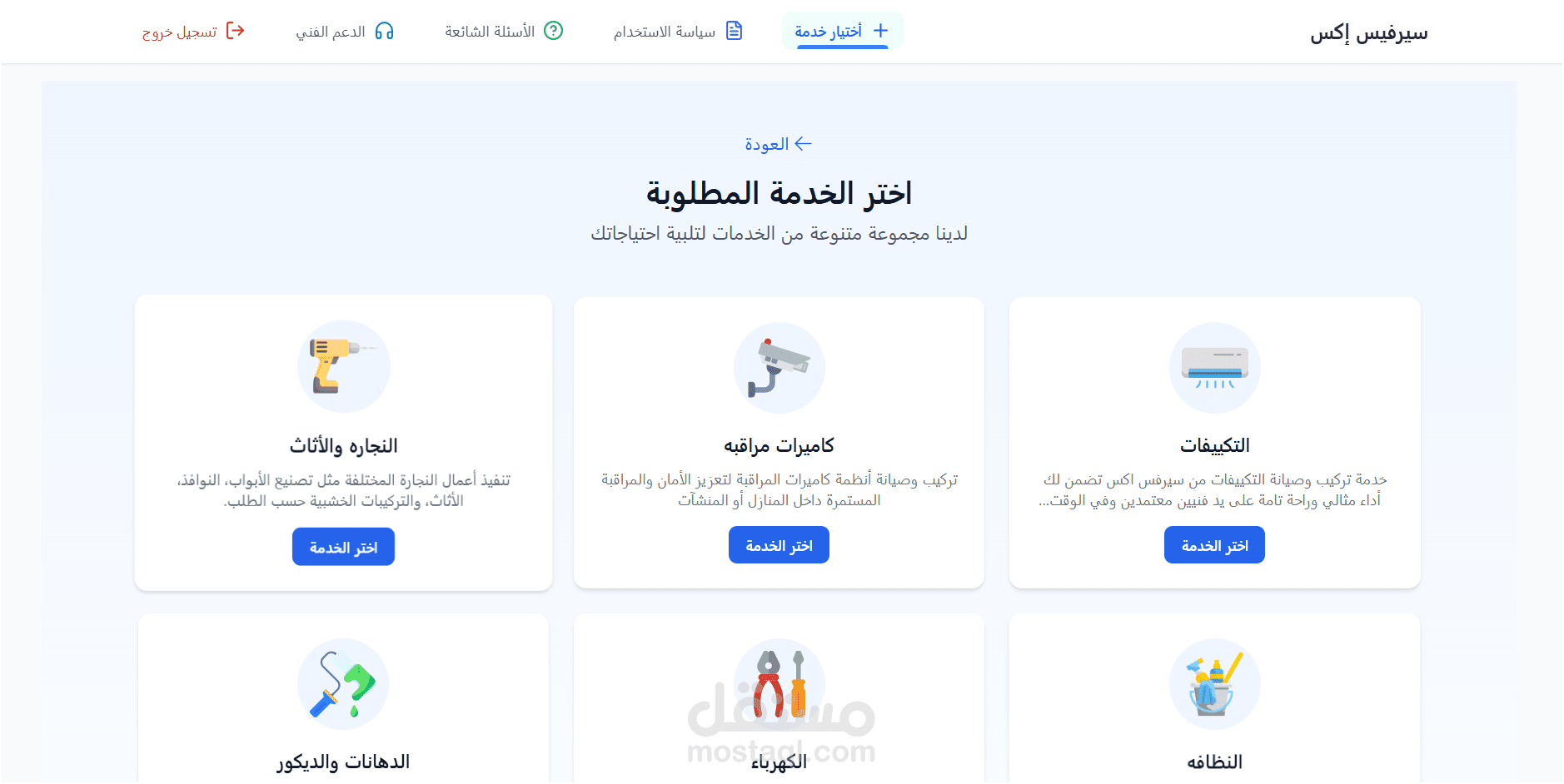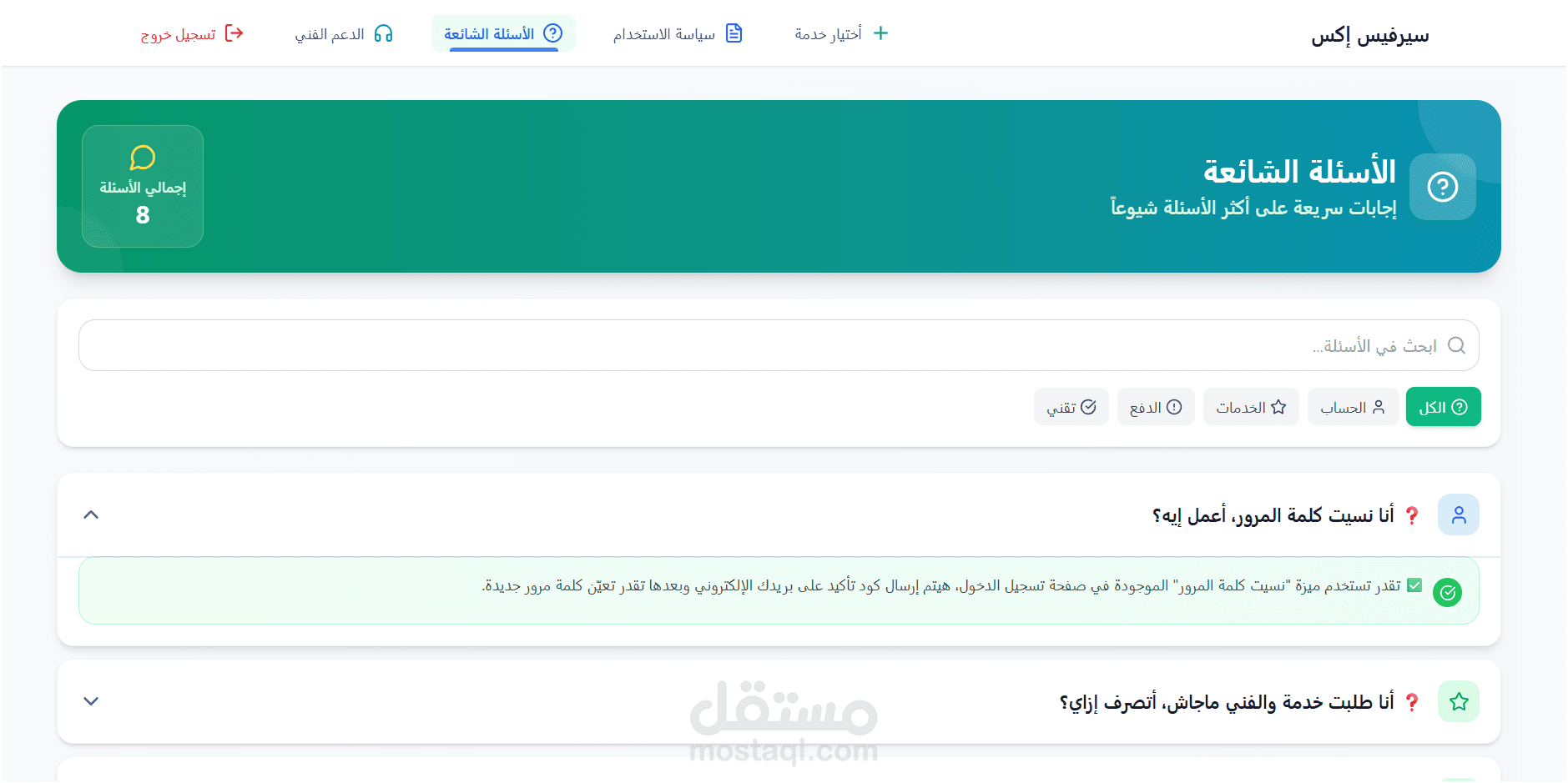 قسم مخصص للرد على الاستفسارات الشائعة، مثل طرق الدفع، سياسة الإلغاء، وموعد وصول الفني.
