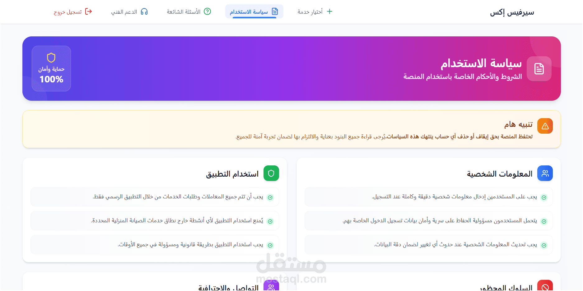 الصفحة كلمة “Terms of Use” و Privacy policies بتوضح حقوق المستخدم وواجبات المنصة والفنيين—عادة في نهاية الموقع.