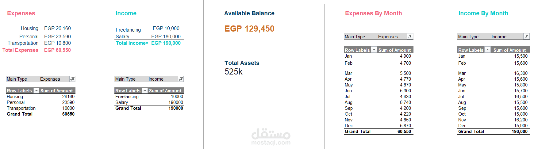 يساعدني هذا التقرير في مراقبة وتحليل حالتي المالية. قمتُ ببنائه باستخدام وظائف Excel المتقدمة مثل PivotTables، وVLOOKUP، وAGGREGATE، بالإضافة إلى أدوات قوية أخرى. يتتبّع هذا التقرير مختلف الجوانب المالية، بما في ذلك الأصول، والمصروفات، والدخل الأساسي والإضافي، وغير ذلك.