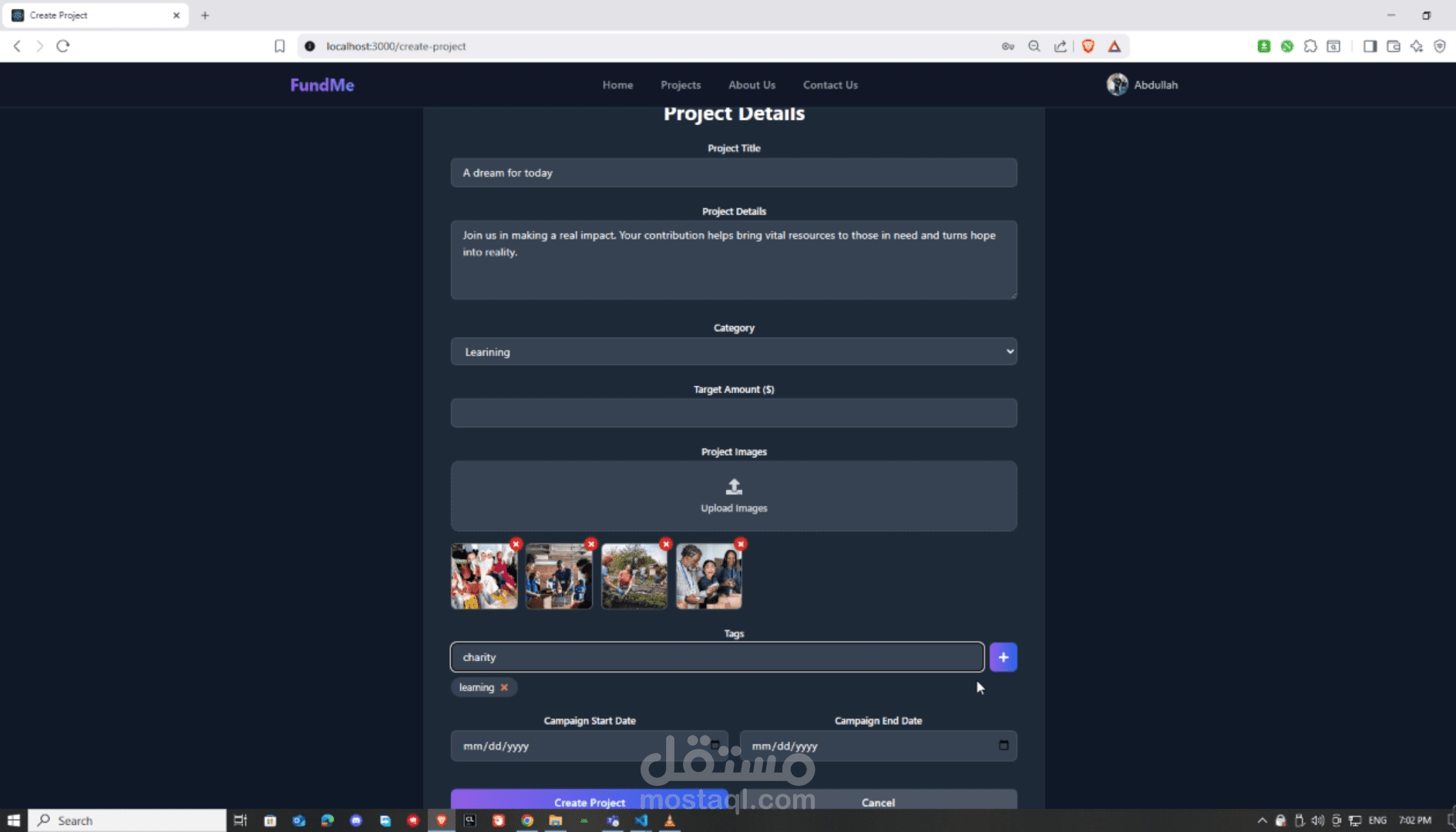 عنوان، تفاصيل، تصنيفات، صور متعددة، هدف مالي، وسوم، مدة الحملة.