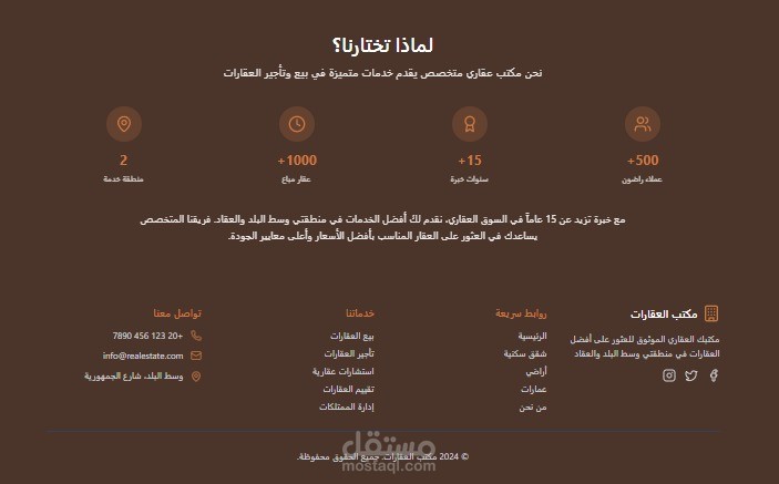 بروكر هو موقع إلكتروني حديث للعقارات، مصمم لمساعدة المستخدمين على تصفح وتصفية وعرض العقارات المعروضة للإيجار والبيع. صُمم الموقع باستخدام Next.js وTailwind CSS، ويوفر تجربة مستخدم سريعة الاستجابة ومُحسّنة لمحركات البحث. تتيح المنصة للمستخدمين استكشاف قوائم العقارات مع أوصاف مفصلة وصور عالية الجودة وميزات تفاعلية مثل البحث والتصفية ودمج الخرائط.