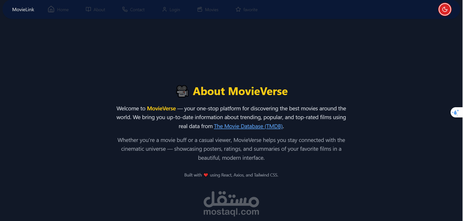 A dynamic movie platform built with React.js and Tailwind CSS, designed to help users explore and save their favorite films. With a sleek interface, real-time movie data, and secure login functionality, the app delivers both performance and an enjoyable viewing experience.
