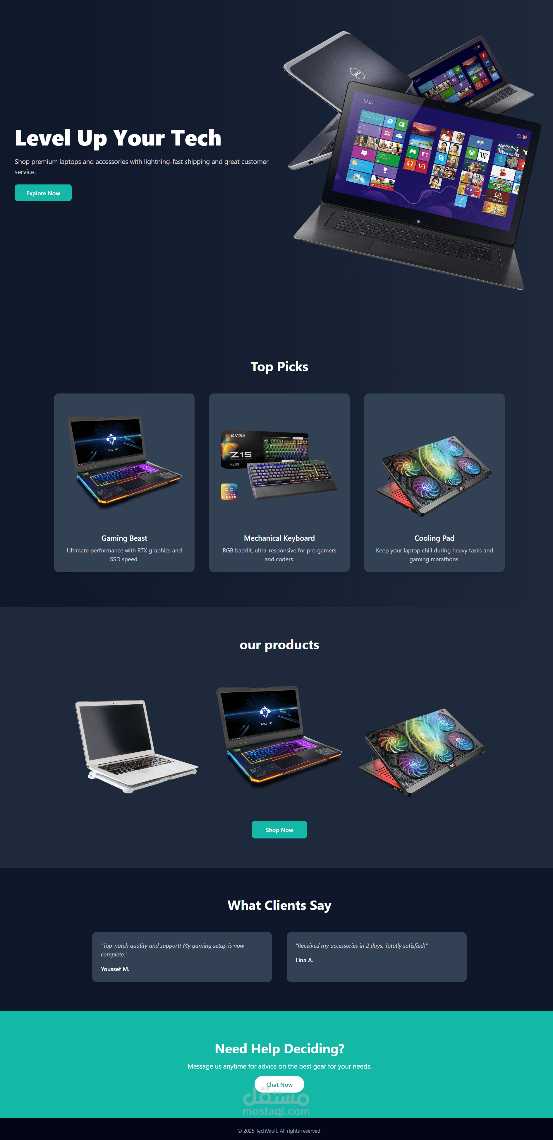 تم تنفيذ صفحة هبوط (Landing Page) مميزة لمتجر إلكتروني يعرض منتجات اللابتوبات وملحقاتها التقنية