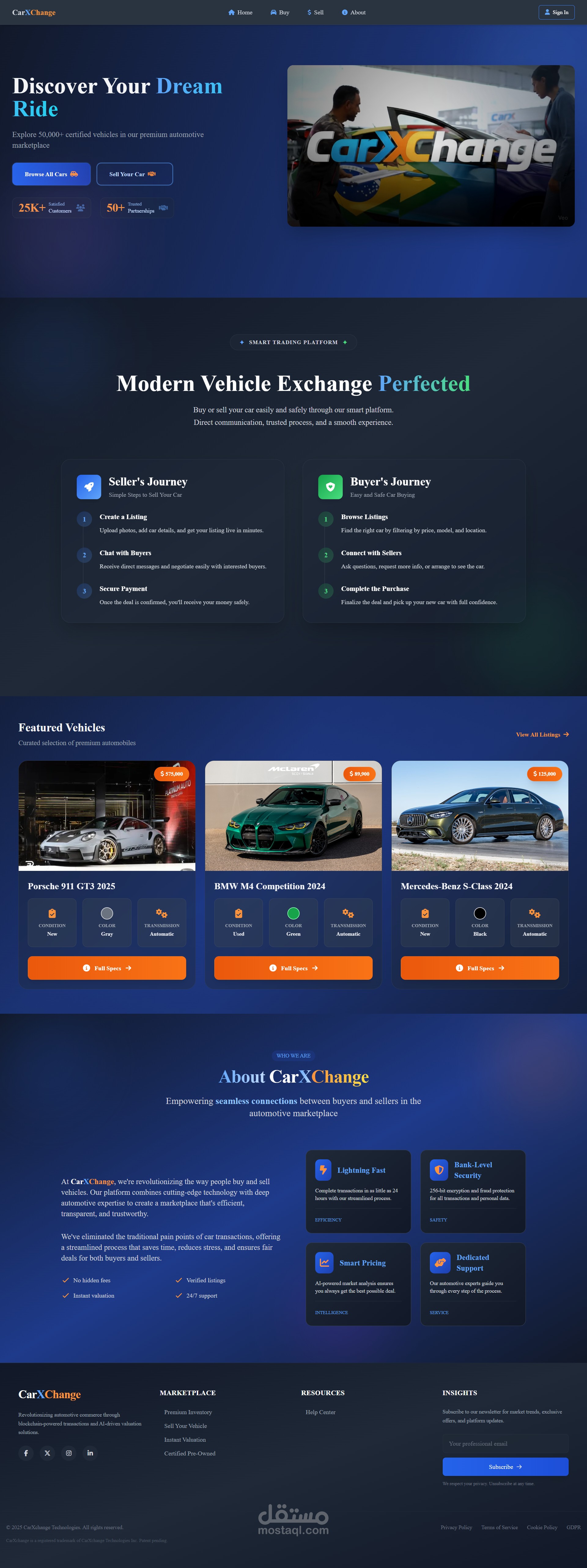 CarXChange هو سوق سيارات متكامل وحديث، تم تصميمه ليكون حلقة وصل موثوقة بين المشترين والبائعين. قمت ببناء هذا التطبيق العصري باستخدام أحدث تقنيات الواجهة الأمامية لتقديم تجربة آمنة، سلسة، وسهلة الاستخدام تضمن إتمام عمليات بيع وشراء المركبات بكل سلاسة.