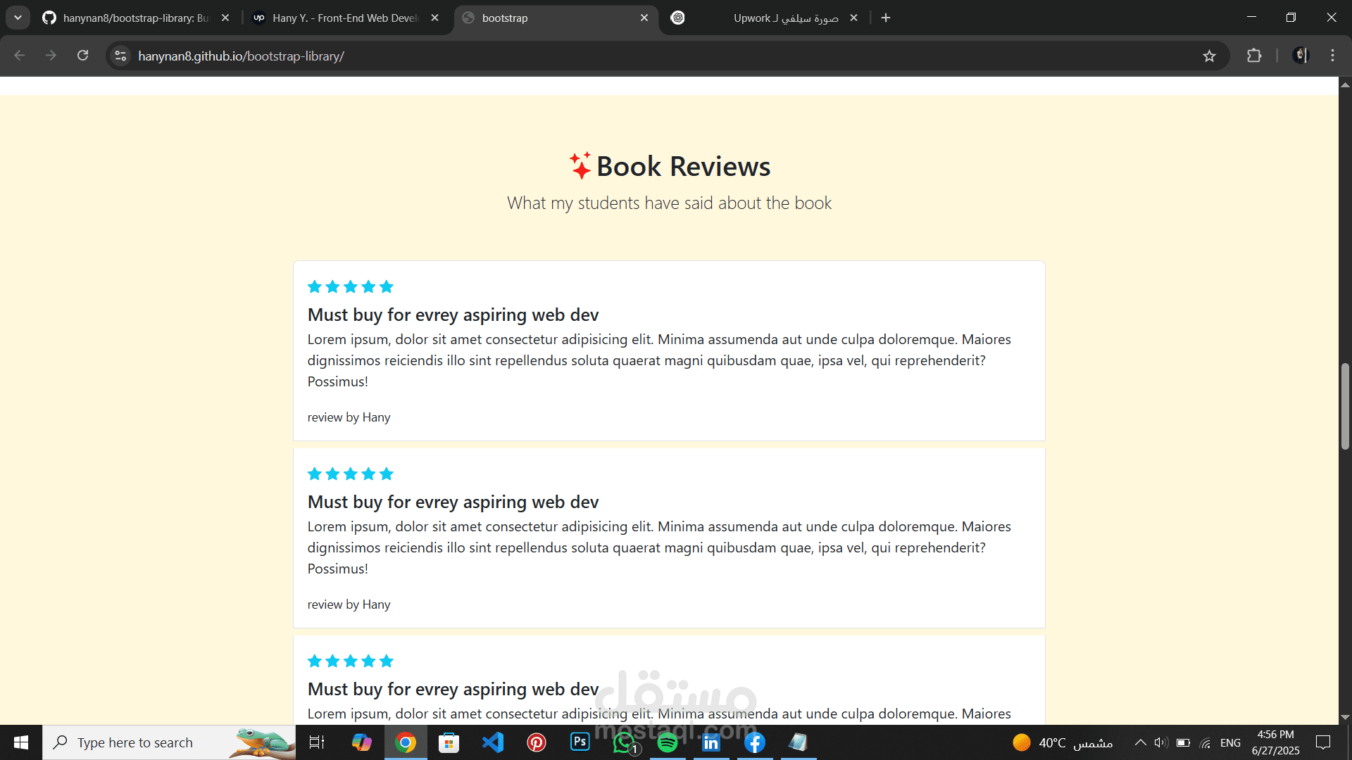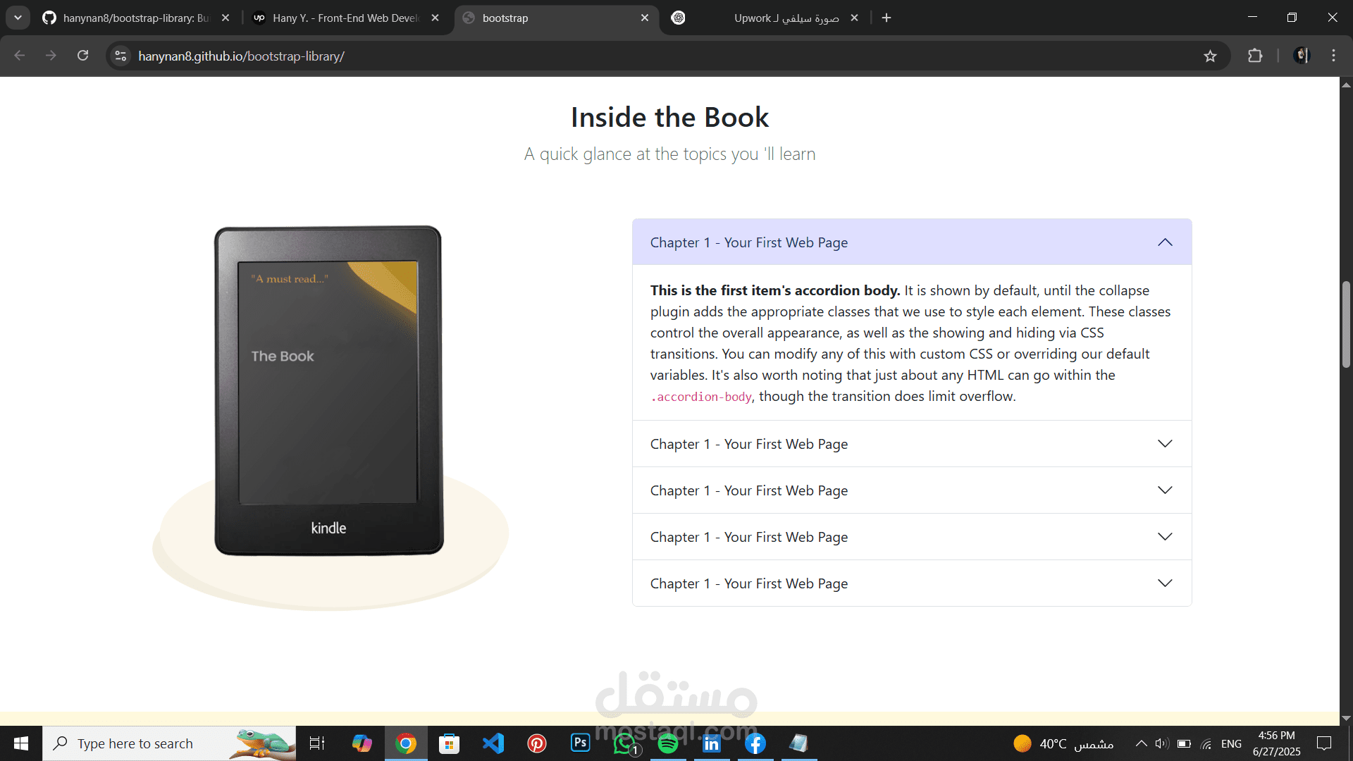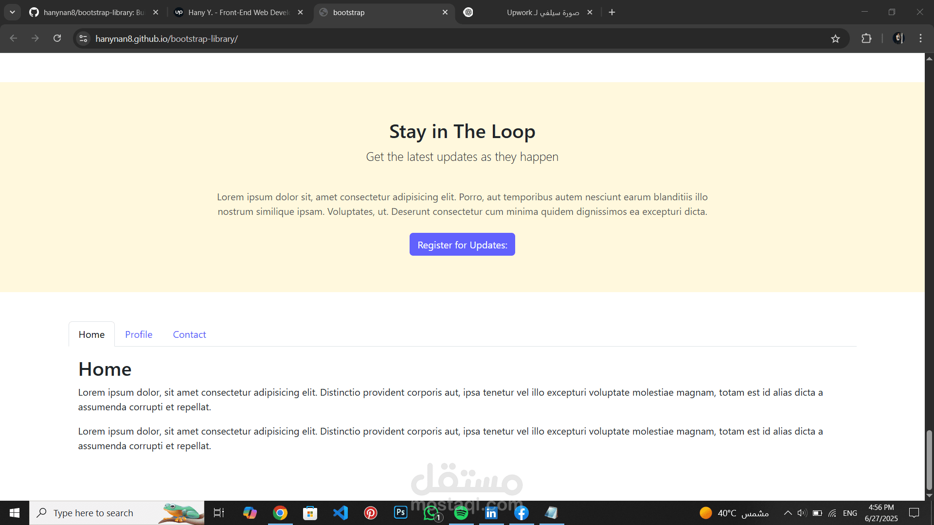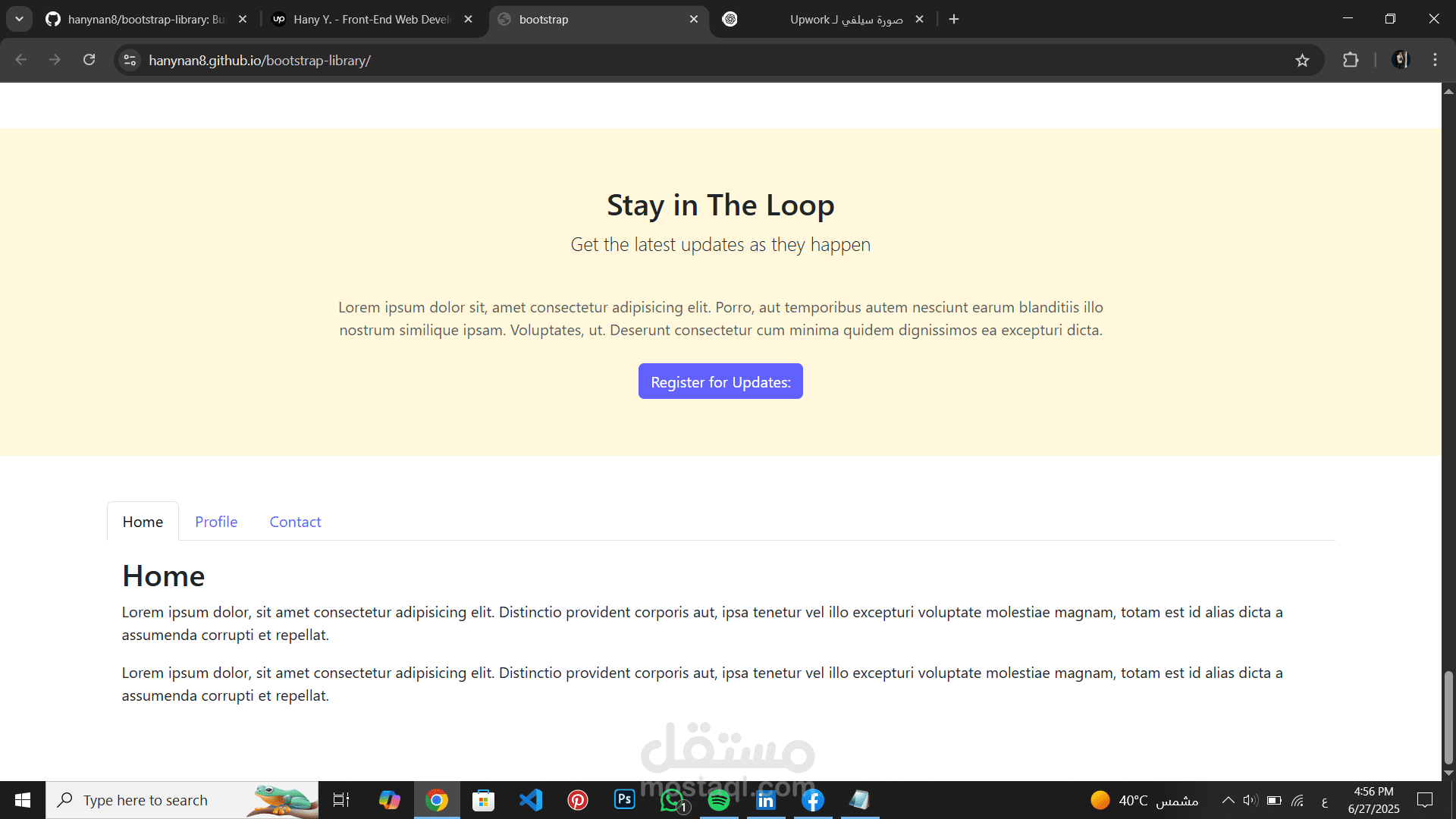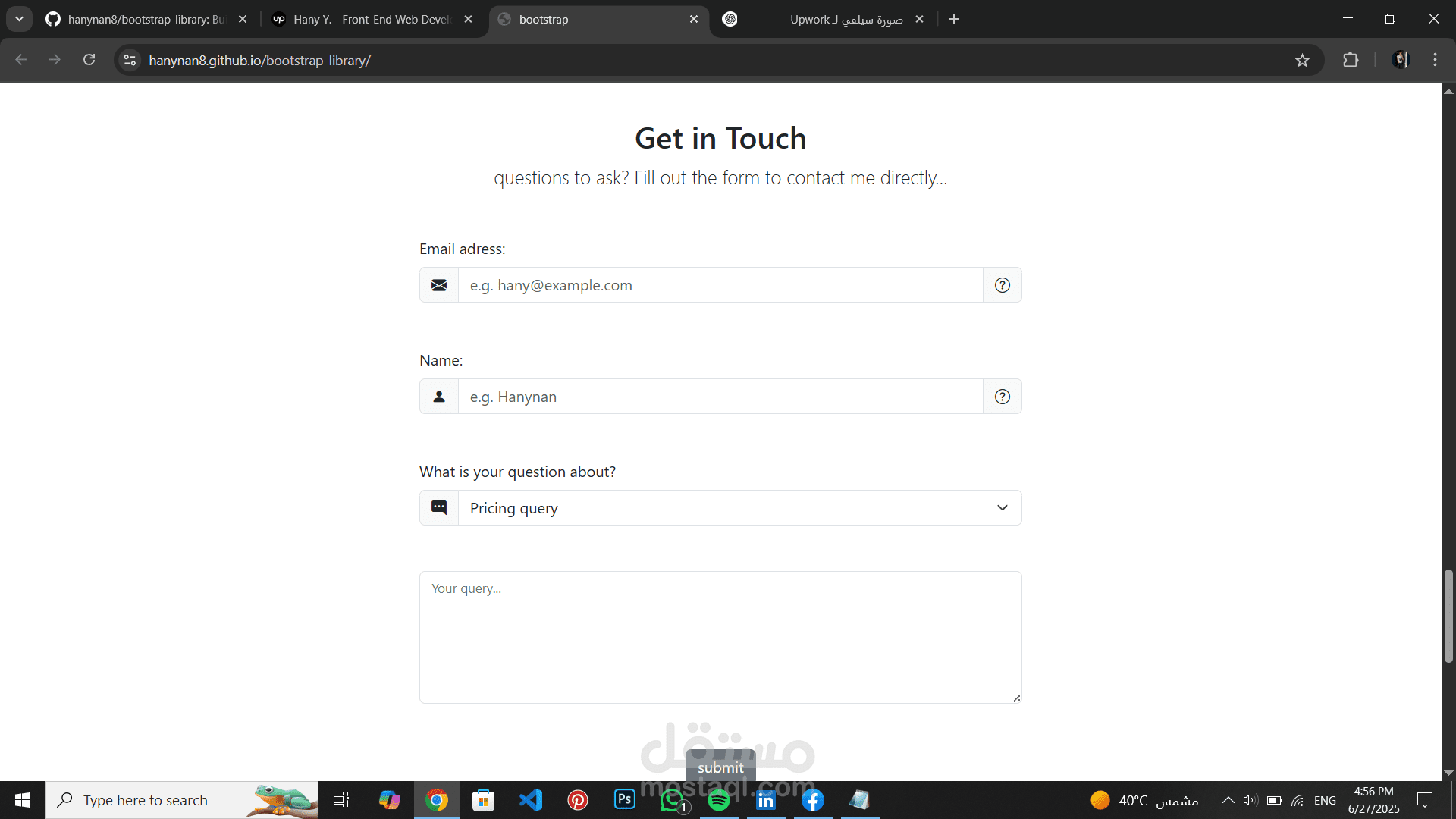 قسم "من نحن"، نموذج تواصل، وتذييل (Footer)