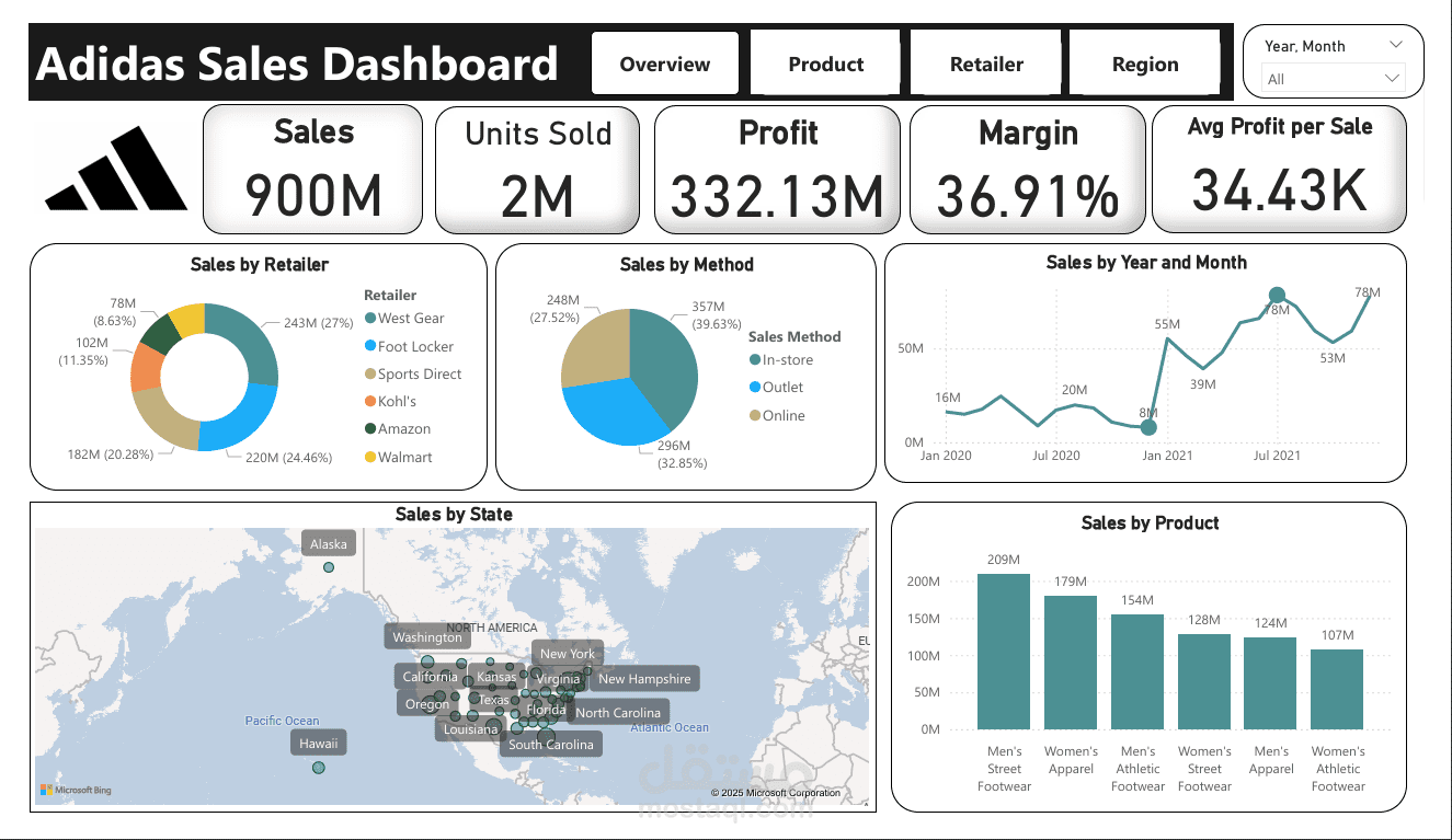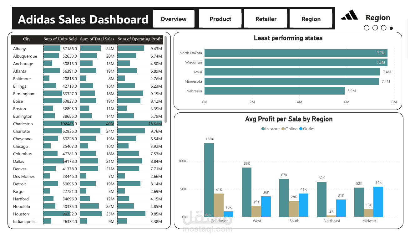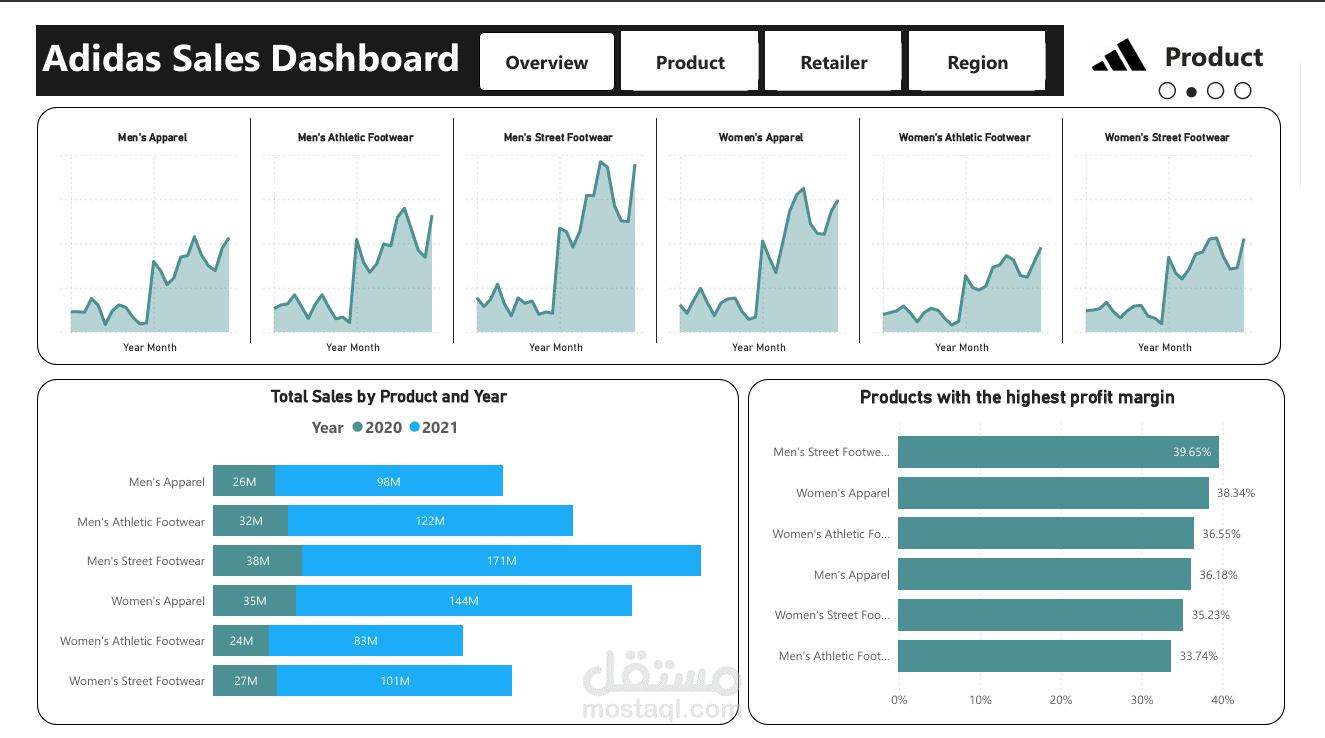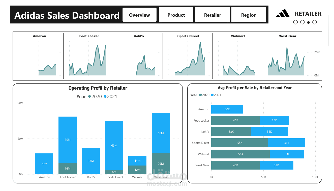 The dashboard is divided into tabs for easy analysis: Overview – Product – Retailer – Region
