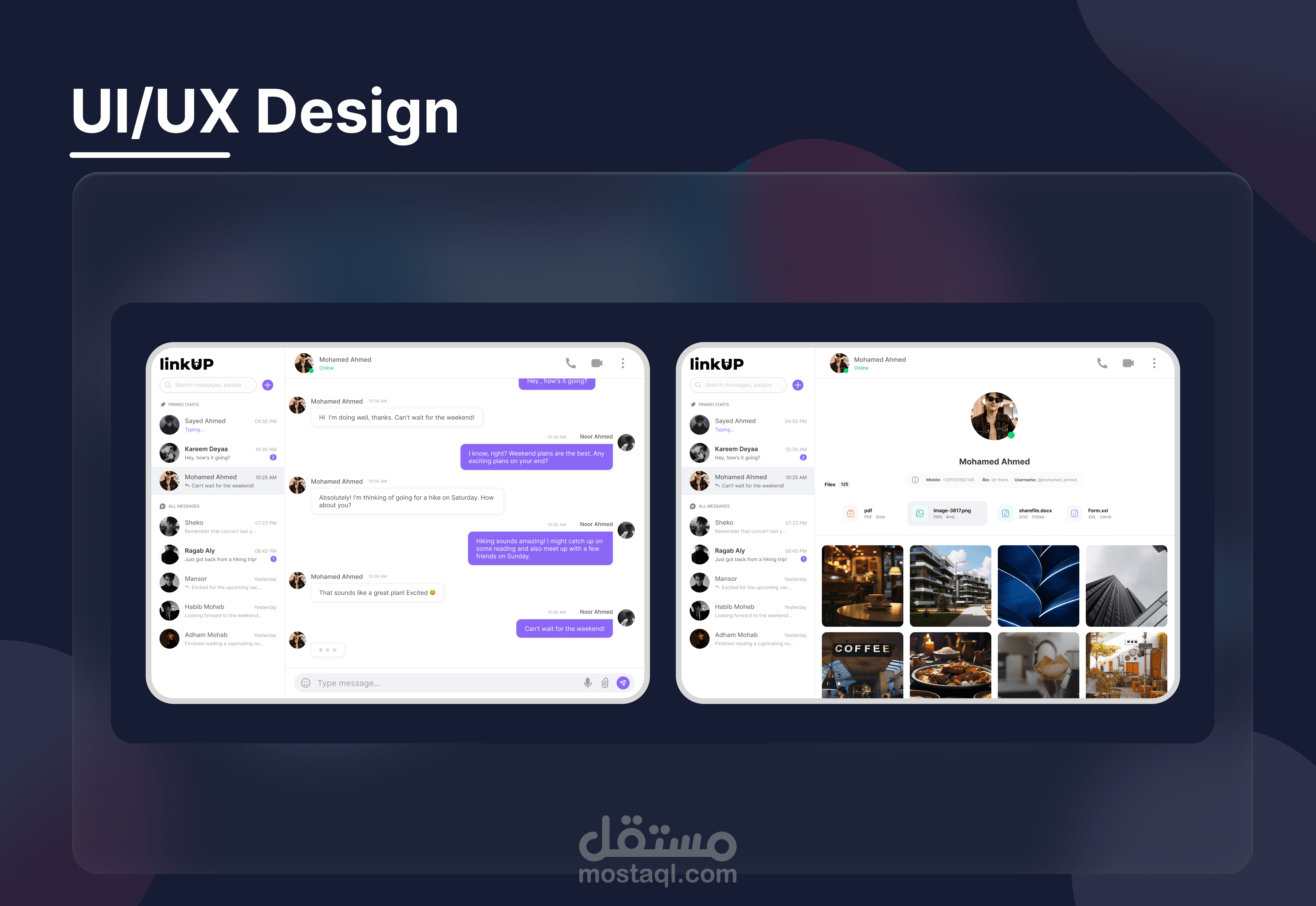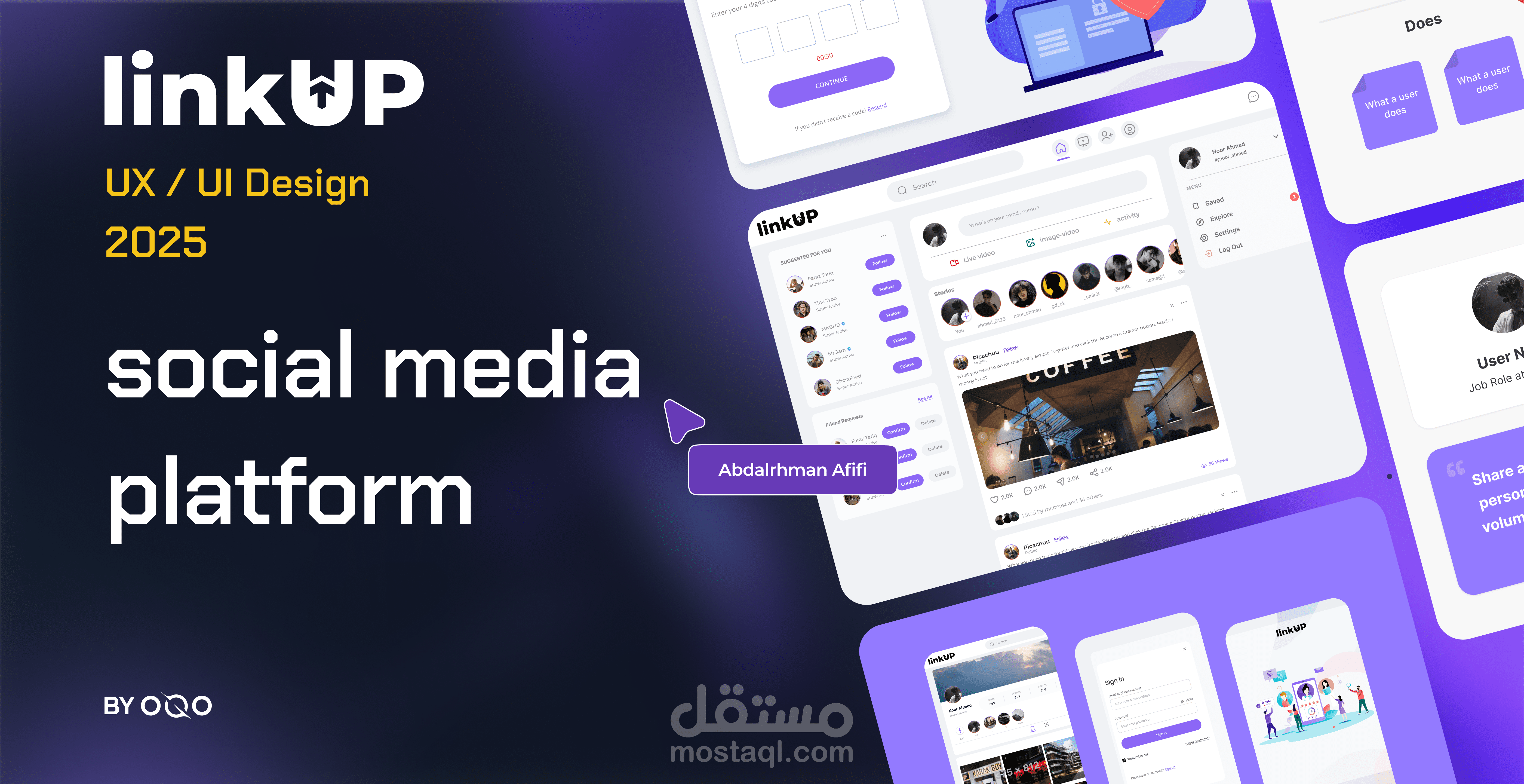 • في مشروع Linkup، كان تركيزي كمصمم واجهات وتجربة مستخدم على تطوير تجربة استخدام حديثة، خالية من التشتت، وتتناسب مع الاستخدام اليومي المكثّف لمنصات التواصل.