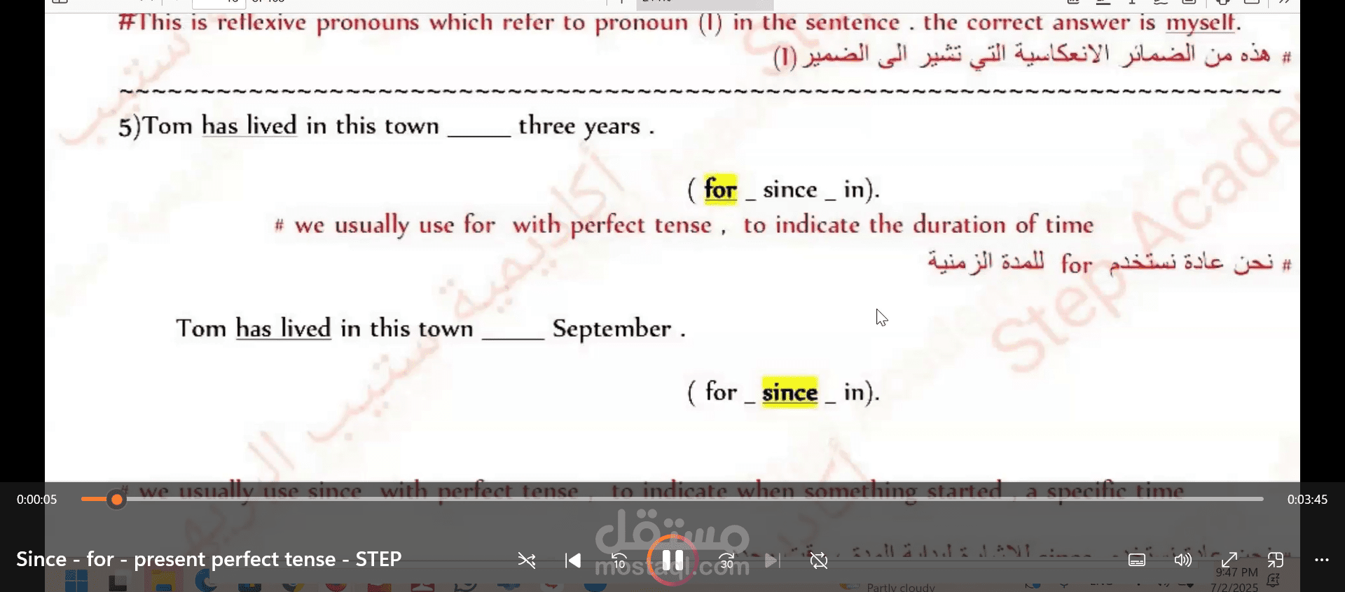 في زمن المضارع التام، تُستخدم "for" و "since" للدلالة على مدة أو نقطة بداية الفعل أو الحالة التي بدأت في الماضي وما زالت مستمرة حتى الحاضر.