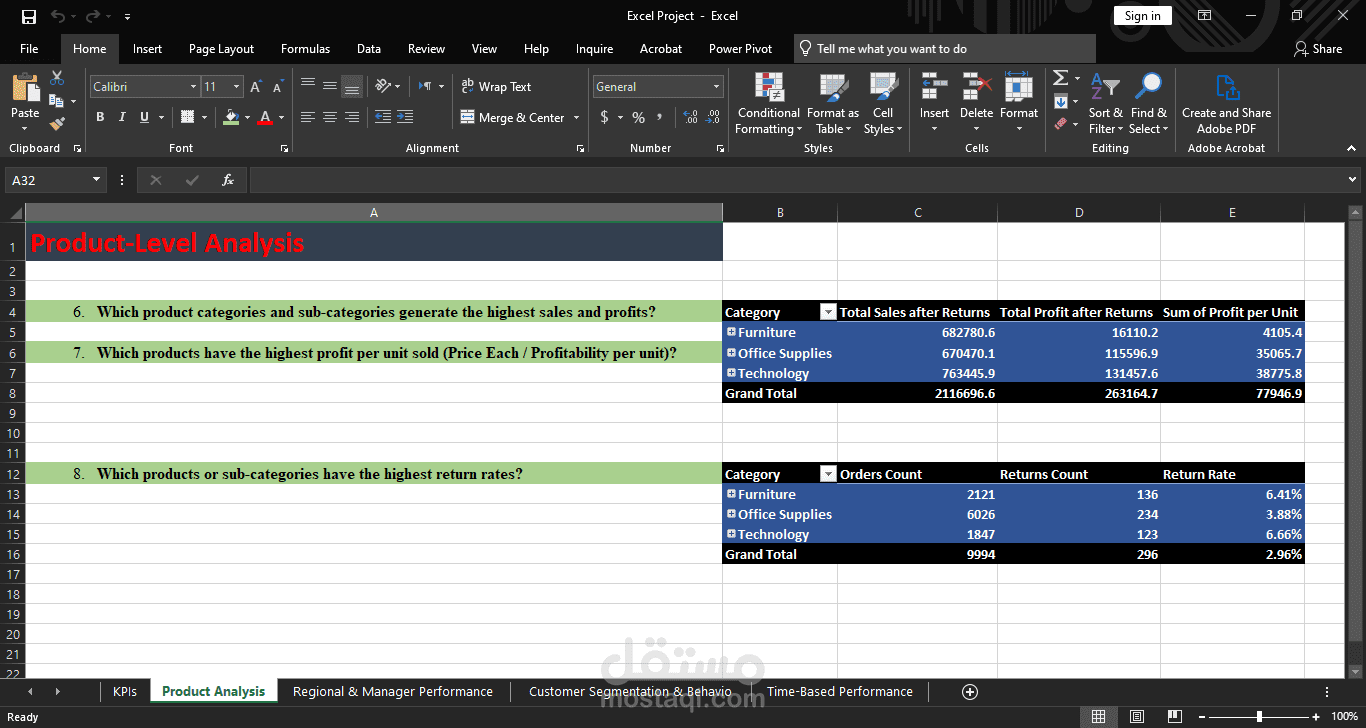 في هذا المشروع، قمت بتحليل بيانات حقيقية لمتجر إلكتروني باستخدام أدوات Excel المتقدمة، وخرجت بنتائج دقيقة وعملية.