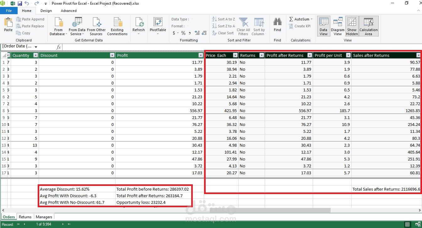 ️ احتساب مؤشرات الأداء (مثل: صافي الربح، عدد المرتجعات، معدل الارتجاع، خسارة الفرص)