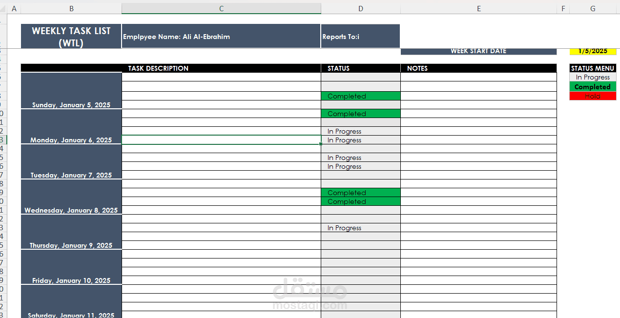 قمت بانشاء جدول تتبع المهام الاسبوعية للموظفين الذين يعملون في الشركة ومنصبي فيها هو مساعد مدير تنفيذي هذا الجدول يستخدم لتتبع اداء الموظفين وتنفيذهم للمهام بشكل اسبوعي لتحسين متابعة الاداء وقياس الاداء الخاص بموظفي الشركات